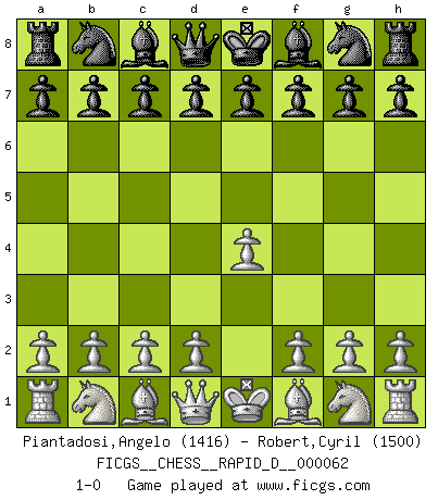 Last move : 1-0 2011 October 4 23:23:29 [Event "FICGS__CHESS__RAPID_D__000062"] [Site "FICGS"] [Date "2011.09.04"] [Round "1"] [White "Piantadosi,Angelo"] [Black "Robert,Cyril"] [Result "1-0"] [WhiteElo "1416"] [BlackElo "1500"] 1.e4 1-0 This chess game has been lost on time (started : 2011.09.04 23:14:22) King's pawn Opening Player White won this chess game. Follow this game move after move (download)Every Pawn is a potential Queen. (James Mason) Die westlichen Werte sind eine Sprache, welche die Putin-Administration nicht versteht. (Garry Kasparov) El Ajedrez se juega con la mente... ¡no con las manos!. (Renaud y Kahn) Je fais ceci parce que dans cinquante coups j'obtiendrai cela; je m'appelle Mikhail Moisevitch Botvinnik. (Botvinnik) Knowledge will give you power, but character respect. (Bruce Lee)