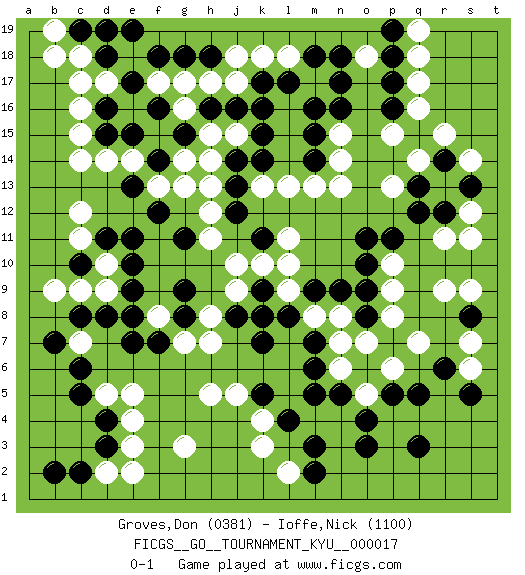 Last move : 0-1 2007 February 5 0:26:57 [Event "FICGS__GO__TOURNAMENT_KYU__000017"] [Site "FICGS"] [Date "2007.01.03"] [Round "1"] [Black "Groves,Don"] [White "Ioffe,Nick"] [Result "0-1"] [Rating 1 "0381"] [Rating 2 "1100"] 1.q3 c16 2.d4 q17 3.r6 r15 4.e17 h17 5.e15 d17 6.c6 k3 7.k16 h15 8.k14 c14 9.n17 k18 10.k17 l18 11.l17 h13 12.e13 c12 13.e11 n15 14.m18 j18 15.m16 r9 16.m3 g3 17.c10 m13 18.m14 n14 19.n16 o18 20.n18 k13 21.m15 j15 22.k15 l13 23.p16 p15 24.p17 q16 25.p18 p9 26.p7 o5 27.m6 o7 28.o8 p8 29.o6 n7 30.n5 p6 31.o3 q7 32.q5 h7 33.e7 d10 34.d11 c11 35.e10 d9 36.e9 c9 37.k5 e3 38.d3 d2 39.c2 e4 40.k7 d5 41.c5 e5 42.d8 c7 43.c8 b9 44.b7 f8 45.e8 k8 46.l8 l9 47.k9 k10 48.j8 j9 49.k8 j10 50.m9 l10 51.n9 m8 52.m7 n8 53.o9 n6 54.m5 l2 55.m2 q18 56.p19 e2 57.b2 e14 58.f14 d14 59.f16 f13 60.f12 g13 61.g11 h5 62.o11 p10 63.o10 n13 64.p11 r11 65.q13 q14 66.r14 p13 67.q12 s14 68.s13 s12 69.r12 s11 70.s8 s9 71.j14 h14 72.j13 h12 73.j12 h11 74.g9 h8 75.g8 g7 76.f7 k4 77.l4 j5 78.p5 s7 79.o4 s6 80.s5 q19 81.k11 l11 82.d18 c18 83.d16 c17 84.f18 g17 85.g18 f17 86.d15 c15 87.h18 j17 88.c19 d19 89.e19 b19 90.d19 b18 91.h16 g16 92.j16 f15 93.g15 g14 0-1 Here are the names of the openings (joseki) played in the four corners : Corner d16 : c16 e17 Komoku (Somok, Xiao~mu`) 3-4 Point. The komoku (3-4) point is the traditional corner enclosure move.. Ikken Kakari (Hankan Keolch'im, Yi Gua`jiao~, 1-Space Low Pincer). The small knight move is the basic approach move to the 3-4 point stone. It has been continually used for over four centuries. There are limitless variations, with new moves constantly being discovered. Black 2 opens the door to a treaure store of joseki. Player White won this Go (weiqi, baduk) game. Follow this game move after move (download)To invade, need 20 points in open area; otherwise, keshi is best. (Yang Yilun, 7p) I know the human being and fish can coexist peacefully. (George W. Bush, Saginaw sept. 29, 2000)