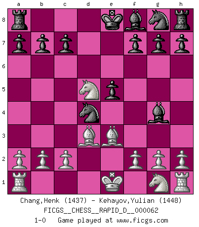 Last move : 1-0 2011 November 5 12:35:12 [Event "FICGS__CHESS__RAPID_D__000062"] [Site "FICGS"] [Date "2011.09.04"] [Round "1"] [White "Chang,Henk"] [Black "Kehayov,Yulian"] [Result "1-0"] [WhiteElo "1437"] [BlackElo "1448"] 1.e4 Nc6 2.d4 d5 3.exd5 Qxd5 4.Nc3 Qxd4 5.Qxd4 Nxd4 6.Bd3 e5 7.Be3 Bg4 8.Nd5 1-0 This chess game has been lost on time (started : 2011.09.04 23:14:22) KP : Nimzovich defense, Marshall gambit Player White won this chess game. Follow this game move after move (download)The only thing Chess players have in common is Chess. (Lodewijk Prins) Garry Kasparov war erst in der Großmeister-Organisation GMA, dann in der Profischach-Vereinigung PCA, zum Schluss kehrte er wieder in den Schoß der FIDE zurück. Aber gut, manche Leute sind flexibel (Viswanathan Anand) El Ajedrez es un terrible juego. Si no controlas el centro, tu oponente tiene una posición mas holgada. Si tienes control del centro, ¡entonces realmente tu tienes algo de que preocuparte!. (Siegbert Tarrasch) Ce n'est pas pour s'amuser qu'il joue aux échecs : il célèbre un culte. (Vladimir Nabokov) I couldn't make any sense out of what this particular thread is about. It sounds like R2 D2 computer speaking. A space fight ?!? Some 'command' problems in Moscow ? Some killers & narcotic addicts attacking some game & a god wannabe ?? (Dinesh De Silva, lost in a russian conflict in FICGS forum)