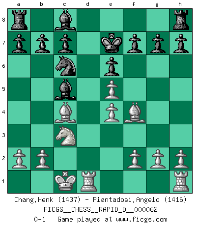Last move : 0-1 2011 October 29 0:59:41 [Event "FICGS__CHESS__RAPID_D__000062"] [Site "FICGS"] [Date "2011.09.04"] [Round "1"] [White "Chang,Henk"] [Black "Piantadosi,Angelo"] [Result "0-1"] [WhiteElo "1437"] [BlackElo "1416"] 1.d4 d5 2.Bf4 Nf6 3.Nf3 e6 4.c4 Bd6 5.Ne5 Nfd7 6.Nc3 dxc4 7.e4 Nxe5 8.dxe5 Bc5 9.Qxd8+ Kxd8 10.O-O-O Ke7 11.Bxc4 Nc6 0-1 This chess game has been lost on time (started : 2011.09.04 23:14:22) Queen's pawn, Mason variation Queenside Castling by player White (move 10) Player Black won this chess game. Follow this game move after move (download)Only sissies Castle. (Rob Sillars) Über Kasparov: Es ist offensichtlich, daß er in einem totalitären Staat aufwuchs und deshalb zu diktatorischen Zügen neigt. (Viktor Kortschnoi) El Ajedrez es tan interesante por sí solo, que no es necesario un interés monetario para persuadir a una persona a que lo practique; por lo tanto, nunca se juega por dinero. (Benjamin Franklin) Horreur, mais aussi harmonie suprême : qu'y avait-il en effet au monde en dehors des échecs ? Le brouillard, l'inconnu, le non-être... (Vladimir Nabokov) It's not enough to succeed. Others must fail. (Gore Vidal)