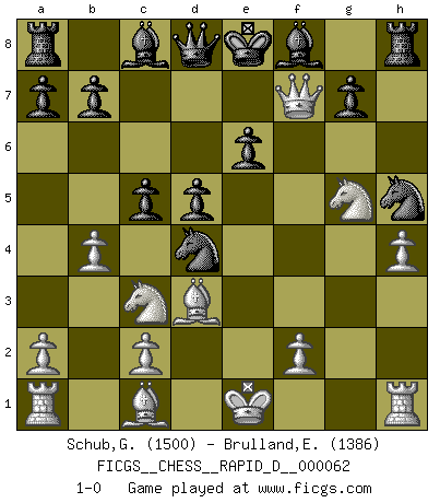 Last move : 1-0 2011 September 8 16:12:10 [Event "FICGS__CHESS__RAPID_D__000062"] [Site "FICGS"] [Date "2011.09.04"] [Round "1"] [White "Schub,Guillaume"] [Black "Brulland,Emmanuel"] [Result "1-0"] [WhiteElo "1500"] [BlackElo "1386"] 1.e4 c6 2.Nc3 d5 3.d3 e6 4.Nf3 Nd7 5.Ng5 h6 6.Nf3 Ngf6 7.e5 Ng8 8.g4 Ne7 9.g5 hxg5 10.Nxg5 Nxe5 11.d4 Nd7 12.Qf3 Nf6 13.h4 Nf5 14.Bd3 Nxd4 15.Qf4 c5 16.b4 Nh5 17.Qxf7+ 1-0 Caro-Kann defense Player White won this chess game. Follow this game move after move (download)Chess is a beautiful mistress. (Bent Larsen) Man gibt nur Pakete auf. (Paul Keres) Yo nunca en mi vida he jugado la Defensa Francesa, que viene siendo la más aburrida de todas las Aperturas. (Wilhelm Steinitz) Fischer est le meilleur joueur du monde et Karpov n'est qu'un joueur de bistrot. (Garry Kasparov, agé de 16 ans) Real knowledge is to know the extent of one's ignorance. (Confucius)