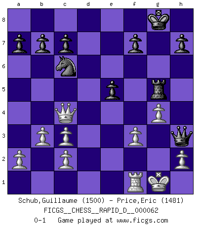 Last move : 0-1 2011 October 13 8:34:16 [Event "FICGS__CHESS__RAPID_D__000062"] [Site "FICGS"] [Date "2011.09.04"] [Round "1"] [White "Schub,Guillaume"] [Black "Price,Eric"] [Result "0-1"] [WhiteElo "1500"] [BlackElo "1481"] 1.e4 e5 2.Nf3 Nc6 3.b3 Nf6 4.Nc3 d5 5.exd5 Nxd5 6.Bc4 Be6 7.Qe2 Nxc3 8.dxc3 Bxc4 9.Qxc4 Qf6 10.O-O Bd6 11.Bg5 Qf5 12.Rac1 O-O 13.Be3 Rae8 14.Nh4 Qh5 15.g3 g5 16.Nf5 Re6 17.Rcd1 Rd8 18.Nxd6 R8xd6 19.Rxd6 Rxd6 20.g4 Qh3 21.Bxg5 Rg6 22.f3 Rxg5 0-1 King's pawn game Kingside Castling by player White (move 10) Kingside Castling by player Black (move 12) Player Black won this chess game. Follow this game move after move (download)Let the perfectionist play postal. (Yasser Seirawan) Man wirke der falschen Auffassung entgegen, als ob jeder Zug Unmittelbares zu leisten habe; auch Werte- und Ruhezüge haben ihre Existenzberechtigung. (Aaron Nimzowitsch) La vida es como un juego de Ajedrez, cambiando con cada movimiento. (Proverbio Chino) Roi des jeux et jeu des rois, les échecs portent en eux un sentiment d'infini. Ils donnent à celui qui s'est efforcé d'en approfondir les arcanes l'impression de n'être pas à la mesure de l'homme; en fait, ils constituent un résumé de l'univers, un microcosme, et figurent cette grande échelle qui, dans les plans de la lumière descend jusqu'à la matière, qui des abîmes insondables remonte jusqu'en l'infini de Dieu. (Pyrame) If you are going through hell, keep going. (Winston Churchill)