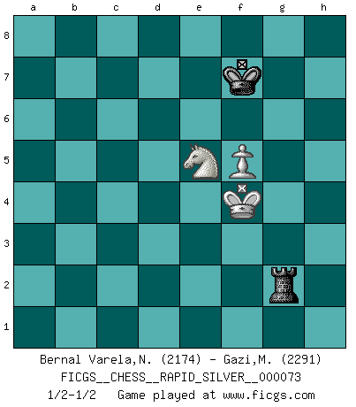 Last move : 1/2-1/2 2012 May 23 7:4:3 [Event "FICGS__CHESS__RAPID_SILVER__000073"] [Site "FICGS"] [Date "2011.09.05"] [Round "1"] [White "Bernal Varela,Nelson"] [Black "Gazi,Miroslav"] [Result "1/2-1/2"] [WhiteElo "2174"] [BlackElo "2291"] 1.e4 c5 2.Nf3 d6 3.d4 cxd4 4.Nxd4 Nf6 5.Nc3 a6 6.Bg5 e6 7.Be2 Be7 8.Qd3 h6 9.Bd2 O-O 10.O-O Qc7 11.Rfd1 b5 12.b4 Nbd7 13.a4 bxa4 14.Qg3 Kh8 15.Rxa4 Bb7 16.f3 Rfd8 17.Bf1 Nb6 18.Ra3 Nh5 19.Qh3 Nf6 20.Qg3 Nc4 21.Bxc4 Qxc4 22.Nce2 Qc7 23.Rc1 Rac8 24.b5 d5 25.Qxc7 Rxc7 26.R3a1 Ra8 27.exd5 Nxd5 28.c4 Nb6 29.Ba5 Bc5 30.Kf1 axb5 31.cxb5 Bd5 32.Bxb6 Bxb6 33.Rxa8+ Bxa8 34.Nc6 g5 35.Rc4 Kg7 36.Nc3 f5 37.Na4 Be3 38.Ne5 Re7 39.b6 Bf4 40.Nc6 Rd7 41.Nc5 Rd1+ 42.Ke2 Rd2+ 43.Ke1 Rxg2 44.Nxe6+ Kf6 45.Nxf4 gxf4 46.Rc5 Rxh2 47.Nd4 Rb2 48.Rxf5+ Kg6 49.Rxf4 Rxb6 50.Rg4+ Kf6 51.Kf2 Rb2+ 52.Ke3 Rb8 53.Rf4+ Kg6 54.Rg4+ Kf7 55.Rg2 h5 56.Rg5 Rh8 57.Rf5+ Kg6 58.Kf4 h4 59.Ne6 h3 60.Nf8+ Kg7 61.Ne6+ Kh6 62.Kg4 Kg6 63.Nf4+ Kg7 64.Kg5 Rh6 65.Ra5 h2 66.Ra7+ Kf8 67.Rxa8+ Ke7 68.Nd5+ Kd7 69.Ra7+ Kc8 70.Ra1 h1Q 71.Rxh1 Rxh1 72.f4 Rf1 73.Nf6 Kc7 74.f5 Kd6 75.Ng4 Ke7 76.Ne3 Rf3 77.Ng4 Rg3 78.Kf4 Rh3 79.Ne5 Rh1 80.Kg5 Rg1+ 81.Ng4 Rg2 82.Kf4 Ra2 83.Ne5 Ra8 84.Ng4 Ra4+ 85.Kg5 Ra5 86.Kg6 Ra3 87.Kg5 Rd3 88.Ne5 Rg3+ 89.Kf4 Rg2 90.Ng4 Kf7 91.Ne5+ 1/2-1/2 Sicilian : Najdorf, 6...e6 Kingside Castling by player Black (move 9) Kingside Castling by player White (move 10) 10 pieces endgame at move 48 : White KRNPP , Black KRBPP WHITE : King + 1 Rook 1 Knight 2 Pawns BLACK : King + 1 Rook 1 Bishop 2 Pawns 9 pieces endgame at move 49 : White KRNPP , Black KRBP WHITE : King + 1 Rook 1 Knight 2 Pawns BLACK : King + 1 Rook 1 Bishop 1 Pawn 8 pieces endgame at move 49 : White KRNP , Black KRBP WHITE : King + 1 Rook 1 Knight 1 Pawn BLACK : King + 1 Rook 1 Bishop 1 Pawn 7 pieces endgame at move 67 : White KRNP , Black KRP WHITE : King + 1 Rook 1 Knight 1 Pawn BLACK : King + 1 Rook 1 Pawn Promotion Queen by player Black (move 70) 6 pieces endgame at move 71 : White KRNP , Black KR WHITE : King + 1 Rook 1 Knight 1 Pawn BLACK : King + 1 Rook 5 pieces endgame at move 71 : White KNP , Black KR WHITE : King + 1 Knight 1 Pawn BLACK : King + 1 Rook This chess game ended in a draw. Follow this game move after move (download)The blunders are all there on the board, waiting to be made. (Savielly Tartakover) Ein Teil des Fehlers ist immer korrekt. (Savielly Grigorievitsch Tartakower) Aún el Rey más flojo huye despavorido ante la amenaza de un Jaque doble. (Aaron Nimzowitsch) Les Echecs représentent une sphère d'idées créatrices basée sur la volonté des deux protagonistes. (Smyslov) Hold em is to stud what chess is to checkers. (Johnny Moss)