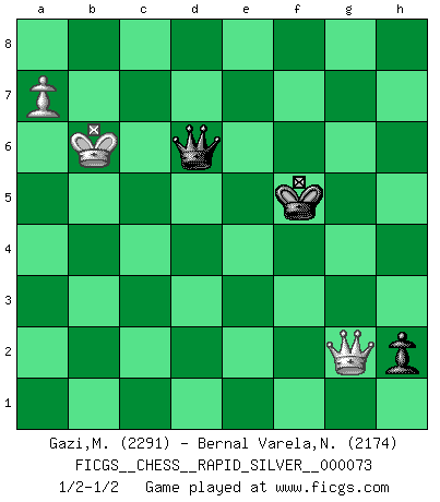 Last move : 1/2-1/2 2012 May 22 8:2:35 [Event "FICGS__CHESS__RAPID_SILVER__000073"] [Site "FICGS"] [Date "2011.09.05"] [Round "2"] [White "Gazi,Miroslav"] [Black "Bernal Varela,Nelson"] [Result "1/2-1/2"] [WhiteElo "2291"] [BlackElo "2174"] 1.e4 c5 2.d4 cxd4 3.c3 dxc3 4.Nxc3 Nc6 5.Nf3 h6 6.Bc4 e6 7.O-O a6 8.Qe2 b5 9.Bd3 Bb7 10.Rd1 Qc7 11.Nd5 exd5 12.exd5 Nce7 13.d6 Qxd6 14.Bxb5 Bd5 15.Rxd5 Qxd5 16.Bc4 Qh5 17.Bf4 g6 18.Re1 Bg7 19.Bd6 Bf6 20.b4 Rc8 21.Qe4 Kf8 22.g4 Rxc4 23.Qa8+ Rc8 24.Qxc8+ Kg7 25.Qxg8+ Rxg8 26.gxh5 Nf5 27.Rd1 gxh5 28.Rd5 Kg6 29.Kf1 Rc8 30.Be5 Rc4 31.a3 Bg5 32.Ne1 Rc1 33.Ke2 f6 34.Bb2 Rc7 35.Nd3 Rc2+ 36.Kf1 Be3 37.Ra5 Bxf2 38.Nf4+ Kg5 39.Nh3+ Kh4 40.Bxf6+ Kxh3 41.Rxf5 Bh4 42.Bxh4 Kxh4 43.Ra5 Rc6 44.Rd5 Kg4 45.Rxd7 Kh3 46.a4 Rb6 47.Rd3+ Kxh2 48.Rb3 Rf6+ 49.Ke2 h4 50.b5 h3 51.b6 Kg2 52.b7 Rf2+ 53.Kd3 h2 54.b8Q h1Q 55.Qb7+ Rf3+ 56.Kc2 Qh3 57.Rxf3 Qxf3 58.Qxa6 Qe4+ 59.Kc3 h5 60.Qc4 Qe5+ 61.Qd4 Qg3+ 62.Kc4 h4 63.a5 Qc7+ 64.Kb5 Qb8+ 65.Ka4 h3 66.Qd5+ Kg3 67.Qd3+ Kg2 68.Qe2+ Kg3 69.Qe3+ Kg2 70.Qe2+ Kg3 71.Qd3+ Kg4 72.Qe2+ Kg5 73.a6 Qf4+ 74.Kb5 h2 75.Qg2+ Kf5 76.a7 Qe5+ 77.Kb6 Qe6+ 78.Kb7 Qd7+ 79.Kb6 Qd6+ 80.Kb5 Qd3+ 81.Ka5 Qd8+ 82.Ka6 Qc8+ 83.Kb6 Qe6+ 84.Kc7 Qe5+ 85.Kb6 Qd6+ 1/2-1/2 Sicilian : Smith-Morra gambit Kingside Castling by player White (move 7) 10 pieces endgame at move 45 : White KRPPP , Black KRPPP WHITE : King + 1 Rook 3 Pawns BLACK : King + 1 Rook 3 Pawns 9 pieces endgame at move 47 : White KRPP , Black KRPPP WHITE : King + 1 Rook 2 Pawns BLACK : King + 1 Rook 3 Pawns Promotion Queen by player White (move 54) Promotion Queen by player Black (move 54) 8 pieces endgame at move 57 : White KQRP , Black KQPP WHITE : King + 1 Queen 1 Rook 1 Pawn BLACK : King + 1 Queen 2 Pawns 7 pieces endgame at move 57 : White KQP , Black KQPP WHITE : King + 1 Queen 1 Pawn BLACK : King + 1 Queen 2 Pawns 6 pieces endgame at move 58 : White KQP , Black KQP WHITE : King + 1 Queen 1 Pawn BLACK : King + 1 Queen 1 Pawn This chess game ended in a draw. Follow this game move after move (download)It is always better to sacrifice your opponent's men. (Savielly Tartakower) Wenn Spassky eine Figur opfert kannst du genauso gut aufgeben. Aber wenn Tal eine Figur opfert, spiel weiter. Er könnte noch eine weitere opfern, und dann ... wer weiß? (Miguel Najdorf) Yo siempre he tenido un ligero sentimiento de lástima por una persona que no tiene conocimiento del Ajedrez. (Siegbert Tarrasch) Les Cavaliers se révèlent fort utiles dans les positions fermées. D'habitude, les Fous sont un peu plus forts que les Cavaliers dans les positions ouvertes. Qu'on le veuille ou non, il restera toujours des exceptions ! Always two there are. No more no less. A master, and an apprentice. (Master Yoda in Star Wars ep.1)