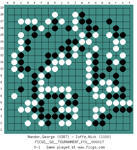 Last move : 0-1 2007 February 9 6:13:44 [Event "FICGS__GO__TOURNAMENT_KYU__000017"] [Site "FICGS"] [Date "2007.01.03"] [Round "1"] [Black "Nandor,George"] [White "Ioffe,Nick"] [Result "0-1"] [Rating 1 "0387"] [Rating 2 "1100"] 1.q17 c17 2.r4 c4 3.q10 p4 4.p3 o3 5.q3 o4 6.k16 k4 7.d10 e3 8.e16 c14 9.d14 c13 10.d13 q15 11.r15 r14 12.r16 n14 13.n17 r5 14.r8 r7 15.r12 s14 16.o2 n2 17.p2 g10 18.c7 e17 19.s6 s5 20.s7 q7 21.e7 g7 22.c12 c15 23.k3 l3 24.j3 j4 25.g3 f2 26.g2 k2 27.f5 f6 28.e6 e5 29.g6 f7 30.e4 d4 31.f4 d5 32.f3 d2 33.h6 h7 34.j6 j7 35.h4 j2 36.h3 k6 37.k5 j5 38.l5 l4 39.l6 k7 40.n7 n9 41.o9 n8 42.o8 o7 43.p7 o6 44.s4 p8 45.p9 q8 46.r9 n11 47.o11 n12 48.k14 f16 49.e15 g17 50.h17 j17 51.h16 h18 52.g15 q12 53.g12 h11 54.k12 k11 55.r6 q5 56.q6 p6 57.f10 r11 58.s11 s12 59.s10 t5 60.t4 b12 61.c11 b11 62.o12 o13 63.q11 r13 64.s15 b6 65.n15 o15 66.o16 m15 67.n16 l18 68.m18 l17 69.m17 l16 70.g9 f9 71.g11 h10 72.e9 f8 73.e8 c9 74.c10 b10 75.o10 n10 76.m13 m14 77.l14 j12 78.j13 l12 79.k13 l13 80.h12 j11 81.d16 d17 0-1 Here are the names of the openings (joseki) played in the four corners : Corner q4 : r4 p4 Komoku (Somok, Xiao~mu`) 3-4 Point. The komoku (3-4) point is the traditional corner enclosure move.. Ikken Takagakari (Hankan Nop'dakeolch'im, Yi Gaogua`jiao~, 1-Space High Approach). The 5-4 approach move has become more popular in modern times, as modern Go emphasizes speed and influence. Corner d16 : c17 e16 San-San (Sam-Sam, San-San) 3-3 Point. The San-San (3-3) point, emphasizing territory at the expense of influence. Ikken Takagakari (Hankan Nop'dakeolch'im, Yi Gaokeolch'im, 1-Space High Approach). Black 2 is a high tight attack with a direction bias. Black continues with 4-5. Tactically, any other response is less advantageous. Corner q16 : q17 q15 Komoku (Somok, Xiao~mu`) 3-4 Point. The komoku (3-4) point is the traditional corner enclosure move.. Ikken Takagakari (Hankan Nop'dakeolch'im, Yi Gaogua`jiao~, 1-Space High Approach). The 5-4 approach move has become more popular in modern times, as modern Go emphasizes speed and influence. Player White won this Go (weiqi, baduk) game. Follow this game move after move (download)Don't reduce your own liberties. (Bill Taylor) It is not enough to be a good player... you must also play well. (Siegbert Tarrasch)