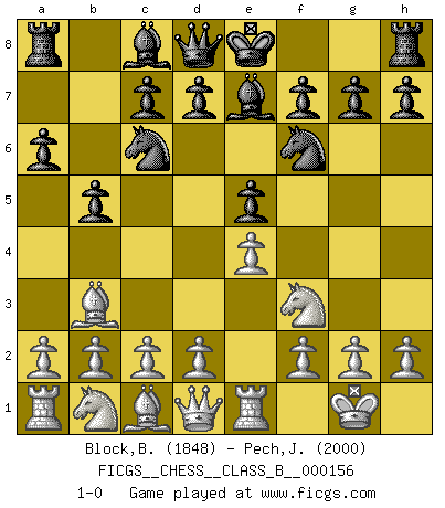 Last move : 1-0 2011 November 26 14:12:19 [Event "FICGS__CHESS__CLASS_B__000156"] [Site "FICGS"] [Date "2011.09.05"] [Round "1"] [White "Block,Benjamin"] [Black "Pech,Jaroslav senior"] [Result "1-0"] [WhiteElo "1848"] [BlackElo "2000"] 1.e4 e5 2.Nf3 Nc6 3.Bb5 a6 4.Ba4 Nf6 5.O-O Be7 6.Re1 b5 7.Bb3 1-0 This chess game has been lost on time (started : 2011.09.05 17:27:42) Ruy Lopez : Closed Kingside Castling by player White (move 5) Player White won this chess game. Follow this game move after move (download)The laws of Chess do not permit a free choice: you have to move whether you like it or not. (Emanuel Lasker) Jede Eröffnung ist gut genug um gespielt zu werden, wenn nur ihr Ruf schlecht genug ist. (Savielly Grigorievitsch Tartakower) No puedes jugar al Ajedrez si eres de corazón noble. (Proverbio Francés) Soyez une menace à chaque fois que vous vous asseyez pour jouer. (Ken Smith) It is not enough to be a good player... you must also play well. (Siegbert Tarrasch)