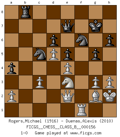 Last move : 1-0 2011 December 21 18:3:3 [Event "FICGS__CHESS__CLASS_B__000156"] [Site "FICGS"] [Date "2011.09.05"] [Round "1"] [White "Rogers,Michael"] [Black "Duenas,Alexis"] [Result "1-0"] [WhiteElo "1916"] [BlackElo "2010"] 1.e4 e5 2.Nf3 Nc6 3.Bb5 a6 4.Ba4 Nf6 5.O-O Be7 6.Re1 b5 7.Bb3 d6 8.c3 O-O 9.h3 Na5 10.Bc2 c5 11.d4 Qc7 12.Bg5 h6 13.Bh4 Rd8 14.Nbd2 Nh5 15.d5 Rb8 16.b3 Bxh4 17.Nxh4 Nf4 18.Qf3 g6 19.Qe3 Nb7 20.Bd3 c4 21.bxc4 Nc5 22.Bf1 bxc4 23.Nxc4 g5 24.Nf3 f5 25.Nfd2 Rf8 26.f3 Bd7 27.Kh2 Bb5 28.Rab1 Na4 29.Rb4 fxe4 30.fxe4 Kg7 31.Rc1 a5 32.R4b1 Bxc4 33.Rxb8 Rxb8 34.Nxc4 Nc5 35.g3 Nh5 36.Bg2 Nf6 37.Qe2 a4 38.Rf1 Qe7 39.Ne3 1-0 Ruy Lopez : Closed Kingside Castling by player White (move 5) Kingside Castling by player Black (move 8) Player White won this chess game. Follow this game move after move (download)In order to improve your game, you must study the endgame before everything else, for whereas the endings can be studied and mastered by themselves, the middle game and the opening must be studied in relation to the endgame. (Jose Raul Capablanca) Ich weiss nicht was Gott gegen mich auf 1.e4 antworten würde. (Robert James Fischer) El Ajedrez es el gimnasio de la mente. (Blaise Pascal) C'est une question de caractère, Beaucoup de gens perdent leur motivation très vite. D'autres, ils sont rares, peuvent la conserver très longtemps. J'aime les échecs, encore aujourd'hui je suis heureux d'analyser des parties. J'aime toujours gagner, je déteste encore perdre. Bien jouer est important pour mon intégrité intellectuelle et morale. Et puis les échecs vivent en ce moment une période historique grâce à Internet. Ils se développent dans les systèmes éducatifs à travers le monde. Ils sortent de leur ghetto, et c'est mon rôle de mener à bien cette révolution. (Gary Kasparov) Lamb in skin of tiger, still fears the wolf. (Chinese proverb)