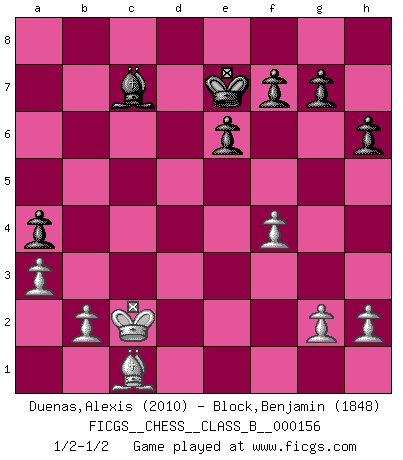 Last move : 1/2-1/2 2012 February 24 21:21:52 [Event "FICGS__CHESS__CLASS_B__000156"] [Site "FICGS"] [Date "2011.09.05"] [Round "1"] [White "Duenas,Alexis"] [Black "Block,Benjamin"] [Result "1/2-1/2"] [WhiteElo "2010"] [BlackElo "1848"] 1.d4 d5 2.c4 c6 3.e3 Nf6 4.Nc3 e6 5.Nf3 Nbd7 6.Bd3 dxc4 7.Bxc4 b5 8.Bd3 Bb7 9.e4 b4 10.Na4 c5 11.e5 Nd5 12.Nxc5 Nxc5 13.dxc5 Bxc5 14.O-O h6 15.Qa4+ Ke7 16.Ba6 Qb6 17.Bxb7 Qxb7 18.Qc2 Rac8 19.Qe4 Rhd8 20.Bd2 Kf8 21.Qh7 Ne7 22.Qh8+ Ng8 23.Qh7 Qb5 24.Rac1 a5 25.Rc2 Ba7 26.Rxc8 Rxc8 27.a3 b3 28.Be3 Bb8 29.Bd4 Qe2 30.Re1 Qc2 31.Qxc2 Rxc2 32.Kf1 Ne7 33.Bc3 Ba7 34.Re2 a4 35.Rxc2 bxc2 36.Bd2 Bb8 37.Ke2 Nc6 38.Bc1 Ke7 39.Kd3 Nxe5+ 40.Nxe5 Bxe5 41.f4 Bc7 42.Kxc2 1/2-1/2 QGD Slav defense Kingside Castling by player White (move 14) This chess game ended in a draw. Follow this game move after move (download)The essence of Chess is thinking about what Chess is. (David Bronstein) Herr Iljumschinow ist ein etwas merkwürdiger Geschäftsmann: Er arbeitet zusammen mit Leuten wie Muammar al-Gaddafi; früher ist das Saddam Hussein gewesen. (Joel Lautier) El Ajedrez por encima de todo... ¡es una pelea!. (Emanuel Lasker) Aidez vos pièces, elles vous aideront. (Paul Morphy) I've never seen so many men wasted so badly. (Blondie in The Good, The Bad and The Ugly)