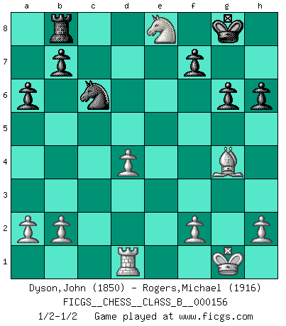 Last move : 1/2-1/2 2011 November 22 12:45:8 [Event "FICGS__CHESS__CLASS_B__000156"] [Site "FICGS"] [Date "2011.09.05"] [Round "1"] [White "Dyson,John"] [Black "Rogers,Michael"] [Result "1/2-1/2"] [WhiteElo "1850"] [BlackElo "1916"] 1.Nf3 d5 2.d4 c6 3.c4 Nf6 4.Qc2 g6 5.Bf4 Bg7 6.e3 O-O 7.Nc3 Na6 8.Be2 dxc4 9.Bxc4 Nb4 10.Qb3 Nbd5 11.Be5 Nb6 12.Be2 Be6 13.Qc2 Nc4 14.Bg3 Nd6 15.Ng5 Bd7 16.O-O Qa5 17.Nf3 c5 18.dxc5 Qxc5 19.Rac1 Nf5 20.Be5 Bc6 21.Bxf6 exf6 22.Qb3 Rad8 23.Rfd1 a6 24.Kf1 Rxd1+ 25.Rxd1 Rc8 26.g4 Ne7 27.Na4 Qa5 28.Nb6 Rb8 29.Kg1 h6 30.Nd4 Be8 31.Nc4 Qc7 32.Qb4 f5 33.Qd6 Qxd6 34.Nxd6 fxg4 35.Bxg4 Nc6 36.Nxe8 Bxd4 37.exd4 1/2-1/2 Reti Opening Kingside Castling by player Black (move 6) Kingside Castling by player White (move 16) This chess game ended in a draw. Follow this game move after move (download)The chessboard is the world, the pieces are the phenomena of the Universe, the rules of the game are what we call the laws of Nature and the player on the other side is hidden from us. (Thomas Huxley) Irgendwie scheint mir sonntags früh um 9 Uhr der Killerinstinkt verloren gegangen zu sein. (Alexej Shirov) La esencia del Ajedrez es pensar acerca de lo que el Ajedrez es. (David Bronstein) Les pièces de l'échiquier étaient impitoyables. Elles le retenaient, elles l'absorbaient. Il y avait de l'horreur en cela, mais aussi une harmonie unique. Car, qu'y a-t-il dans le monde, à part les échecs ? (V. Nabokov) Life is the sum of all your choices. (Albert Camus)