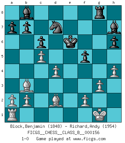 Last move : 1-0 2012 February 18 19:51:0 [Event "FICGS__CHESS__CLASS_B__000156"] [Site "FICGS"] [Date "2011.09.05"] [Round "1"] [White "Block,Benjamin"] [Black "Richard,Andy"] [Result "1-0"] [WhiteElo "1848"] [BlackElo "1954"] 1.e4 c6 2.Nf3 d5 3.Nc3 dxe4 4.Nxe4 Bf5 5.Ng3 Bg6 6.h4 h6 7.Ne5 Bh7 8.Qh5 g6 9.Qf3 f6 10.Bc4 e6 11.Qg4 Qe7 12.Nxg6 f5 13.Qh5 Nf6 14.Nxe7 Nxh5 15.Nxh5 Kxe7 16.d4 Nd7 17.O-O Nb6 18.Bb3 Kf7 19.Re1 Re8 20.Bd2 Rg8 21.g3 Bd6 22.c4 Bb8 23.Nf4 Nd7 24.Nxe6 Rxe6 25.Rxe6 Kxe6 26.c5 1-0 Caro-Kann defense Kingside Castling by player White (move 17) Player White won this chess game. Follow this game move after move (download)Weak points or holes in the opponent's position must be occupied by pieces not Pawns. (Siegbert Tarrasch) Unter Putin wird alles Geld aus Russland wie von einem Staubsauger nach Moskau umgeleitet, das ist wie ein schwarzes Loch. (Garry Kasparov) Cuando tengas duda... ¡juega al Ajedrez!. (Tevis) Même un GMI sait rarement calculer sur plus de cinq coups une attaque à sacrifices. (Rudolf Spielmann) No, no, you're not thinking; you're just being logical. (Niels Bohr)