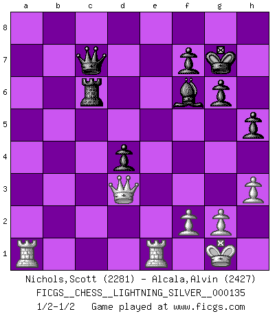 Last move : 1/2-1/2 2011 September 5 20:53:25 [Event "FICGS__CHESS__LIGHTNING_SILVER__000135"] [Site "FICGS"] [Date "2011.09.05"] [Round "1"] [White "Nichols,Scott"] [Black "Alcala,Alvin"] [Result "1/2-1/2"] [WhiteElo "2281"] [BlackElo "2427"] 1.e4 c5 2.Nf3 d6 3.d4 cxd4 4.Nxd4 Nf6 5.Nc3 a6 6.Bg5 e6 7.Be2 Be7 8.Qd3 b5 9.Bf3 Ra7 10.a4 b4 11.Na2 a5 12.c3 Ba6 13.Nb5 Nc6 14.Qc2 Rd7 15.cxb4 Ne5 16.Be2 Bb7 17.Bxf6 Bxf6 18.O-O O-O 19.bxa5 Qxa5 20.Rad1 Rc8 21.Nac3 d5 22.Qb3 Rcd8 23.exd5 exd5 24.Rfe1 g6 25.Nd4 Kg7 26.Ncb5 Nc6 27.Nxc6 Bxc6 28.Qc2 Ba8 29.Bg4 Rb7 30.Bf3 Qb4 31.b3 Rb6 32.h3 h5 33.Re2 Rc6 34.Qd2 Qxb3 35.Nd4 Qxa4 36.Nxc6 Bxc6 37.R2e1 Qa6 38.Qc2 Rc8 39.Qd3 Qa5 40.Rb1 d4 41.Bxc6 Rxc6 42.Ra1 Qc7 1/2-1/2 Sicilian : Najdorf, 6...e6 Kingside Castling by player White (move 18) Kingside Castling by player Black (move 18) This chess game ended in a draw. Follow this game move after move (download)Chess is a matter of delicate judgment, knowing when to punch and how to duck. (Bobby Fischer) Mein erstes Ziel war nicht, die Partie zu gewinnen, sondern eine Figur zu opfern. -- der junge (Wilhelm Steinitz) Bobby Fischer es el jugador de Ajedrez mas grande que jamás haya existido. (Ken Smith) Les échecs sont plus proches de l'art de l'assassinat que de l'art de la guerre. (Arturo Perez-Reverte) Now the reason the enlightened prince and the wise general conquer the enemy whenever they move and their achievements surpass those of ordinary men is foreknowledge. (Sun Tzu)