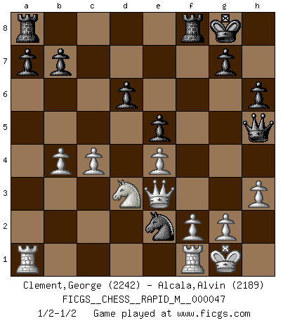 Last move : 1/2-1/2 2011 November 7 16:49:49 [Event "FICGS__CHESS__RAPID_M__000047"] [Site "FICGS"] [Date "2011.09.05"] [Round "1"] [White "Clement,George"] [Black "Alcala,Alvin"] [Result "1/2-1/2"] [WhiteElo "2242"] [BlackElo "2189"] 1.e4 c5 2.Nf3 d6 3.Bb5+ Bd7 4.Bxd7+ Qxd7 5.c4 Nc6 6.Nc3 e5 7.d3 Be7 8.O-O Nf6 9.Bg5 h6 10.Bxf6 Bxf6 11.a3 Bd8 12.Nd5 Ne7 13.Ne3 O-O 14.b4 Bb6 15.Qe2 f5 16.Nh4 fxe4 17.dxe4 cxb4 18.axb4 Bxe3 19.Qxe3 Qg4 20.Nf3 Ng6 21.h3 Qh5 22.Ne1 Nf4 23.Nd3 Ne2+ 1/2-1/2 Sicilian : Canal-Sokolsky attack, Sokolsky variation Kingside Castling by player White (move 8) Kingside Castling by player Black (move 13) This chess game ended in a draw. Follow this game move after move (download)Spassky will not be psyched out by Fischer. (Mike Goodall) Ich war schon mal beim Dopingtest. Da musste ich Urin abgeben, während Dritte zusahen. (Elisabeth Pähtz) Un Peón pasado es un criminal, quién debe ser mantenido bajo candado y llave. Leves medidas, tales como vigilancia policiaca, no son suficientes. (Aaron Nimzovich) Nous sommes les pions de la mystérieuse partie d'Echecs jouée par Dieu. Il nous déplace, nous arrête, nous pousse encore, puis nous lance un à un dans la boîte du Néant. Epitaphe sur la tombe de David Janowsky (1868-1927). But they are useless. They can only give you answers. (Pablo Picasso, about computers)