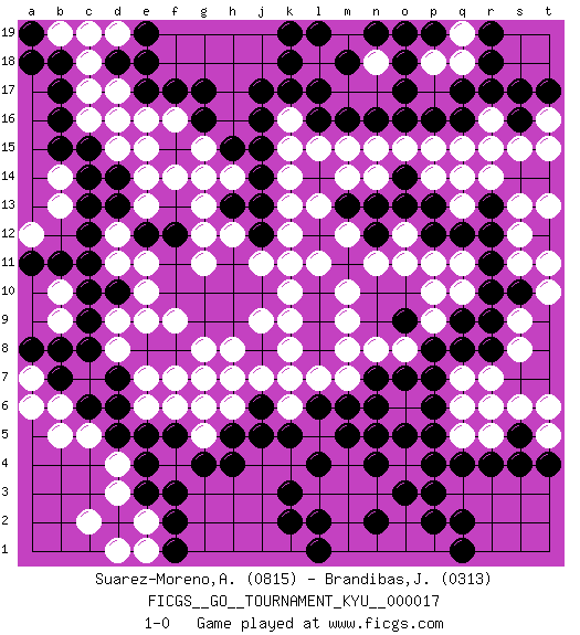 Last move : 1-0 2007 April 21 19:6:54 [Event "FICGS__GO__TOURNAMENT_KYU__000017"] [Site "FICGS"] [Date "2007.01.03"] [Round "1"] [Black "Suarez-Moreno,Alejandro"] [White "Brandibas,Jerome"] [Result "1-0"] [Rating 1 "0815"] [Rating 2 "0313"] 1.q16 d16 2.p4 d4 3.r4 f16 4.d14 e15 5.c15 e13 6.d13 d12 7.e12 e11 8.f12 e14 9.c12 d11 10.c11 g11 11.c9 g13 12.c6 c5 13.d6 e6 14.d5 b5 15.e5 e7 16.d7 d8 17.c8 d9 18.d10 e10 19.c10 b6 20.b7 a7 21.a8 a6 22.e4 d3 23.e3 e2 24.f2 d1 25.q12 q10 26.q8 p11 27.p12 o12 28.o13 n11 29.m13 m12 30.r10 q11 31.r11 n14 32.n13 p14 33.p13 q14 34.r15 r14 35.r13 s13 36.o17 q13 37.r12 s15 38.s16 q15 39.p16 r16 40.r17 r15 41.s17 o15 42.m16 m14 43.l14 l15 44.l16 k14 45.l12 l13 46.n12 o11 47.m11 m10 48.l10 m9 49.l9 m8 50.l8 l7 51.l4 k11 52.j8 l11 53.n7 m12 54.f8 f7 55.e8 g7 56.h7 h6 57.h4 e9 58.k7 g8 59.l6 m7 60.m6 h8 61.j6 j7 62.h5 h7 63.j5 k12 64.o9 n8 65.o7 o8 66.p8 p9 67.q9 p10 68.j16 k9 69.g17 k8 70.e17 k6 71.k5 k7 72.j14 r9 73.r8 s9 74.s10 s8 75.s7 t11 76.t9 c16 77.b16 d17 78.d18 d15 79.c14 t10 80.t8 s12 81.j12 g12 82.g14 f14 83.f17 h14 84.h15 g15 85.h13 g14 86.g16 k15 87.j15 k16 88.k17 h12 89.j13 j11 90.j17 c18 91.e18 d19 92.e19 c19 93.b17 c17 94.b18 t16 95.t17 t15 96.f1 s11 97.f5 g5 98.g4 g6 99.n16 e1 100.f3 b19 101.a18 e16 102.o14 t13 103.o16 n3 104.o3 m4 105.n6 o2 106.p2 n1 107.l2 o4 108.p3 m1 109.l1 m2 110.n5 l3 111.k3 m3 112.k2 p1 113.q1 o1 114.q2 r6 115.p7 s6 116.s5 q5 117.q4 r5 118.s4 r7 119.p5 b9 120.b8 b10 121.b11 k13 122.o5 t5 123.t4 t6 124.t7 n15 125.n4 m15 126.m5 s9 127.r9 s8 128.p6 q18 129.q17 p18 130.o18 o19 131.n19 q19 132.r18 n18 133.p19 m19 134.o19 l18 135.l17 p15 136.k18 q6 137.k19 q7 138.r19 b13 139.c13 a12 140.a11 j9 141.n2 c2 142.a19 b14 143.b15 f9 144.l19 k10 145.pass f6 146.m18 pass 147.pass pass 148.pass 1-0 Here are the names of the openings (joseki) played in the four corners : Corner d4 : d4 c9 Hoshi (Hwajeom, Seongjeom, Xingwei`) 4-4 Point. The star or hoshi (4-4) point, emphasizing influence at the potential expense of territory. Player Black won this Go (weiqi, baduk) game. Follow this game move after move (download)Go uses the most elemental materials and concepts - line and circle, wood and stone, black and white - combining them with simple rules to generate subtle strategies and complex tactics that stagger the imagination. (Iwamoto Kaoru, 9 dan professional Go player and former Honinbo title holder) The human is the only animal species whose members are able to talk themselves into difficulties that would not otherwise exist. (Wendell Johnson)