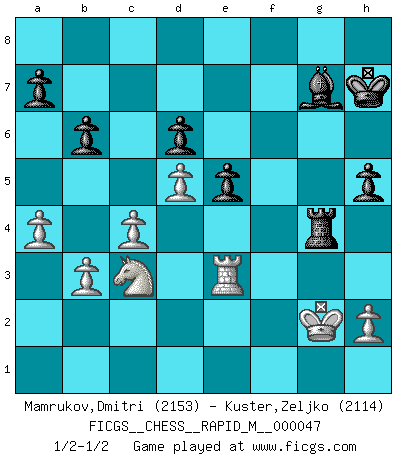 Last move : 1/2-1/2 2011 October 3 0:44:58 [Event "FICGS__CHESS__RAPID_M__000047"] [Site "FICGS"] [Date "2011.09.05"] [Round "1"] [White "Mamrukov,Dmitri"] [Black "Kuster,Zeljko"] [Result "1/2-1/2"] [WhiteElo "2153"] [BlackElo "2114"] 1.d4 Nf6 2.c4 g6 3.Nc3 Bg7 4.e4 d6 5.Nf3 O-O 6.Be2 e5 7.O-O Nc6 8.d5 Ne7 9.Ne1 Nd7 10.f3 f5 11.g4 Nf6 12.Nd3 c6 13.Be3 b6 14.Kh1 Kh8 15.Rg1 Bb7 16.gxf5 gxf5 17.Nf2 Rc8 18.a4 fxe4 19.fxe4 cxd5 20.exd5 Nf5 21.Qd2 Rc7 22.Raf1 Nxe3 23.Qxe3 Bc8 24.Qg5 Rcf7 25.Qh4 Qd7 26.b3 h6 27.Ng4 Ng8 28.Rxf7 Rxf7 29.Qg3 Ne7 30.Ne3 Nf5 31.Nxf5 Qxf5 32.Bg4 Qxg4 33.Qxg4 Bxg4 34.Rxg4 Kh7 35.Kg2 h5 36.Rg3 Rf4 37.Re3 Rg4+ 1/2-1/2 King's Indian : Orthodox, Aronin-Taimanov variation (Yugoslav attack / Mar del Plata variation) Kingside Castling by player Black (move 5) Kingside Castling by player White (move 7) This chess game ended in a draw. Follow this game move after move (download)In a gambit you give up a Pawn for the sake of getting a lost game. (Samuel Standige Boden) Ich trinke, ich rauche, ich spiele, ich liebe Frauen aber Fernschach ist ein Laster, das ich nicht habe. (Mikhail Nekhemyevich Tal) ¿Quién es tu oponente esta tarde? Esta tarde mi oponente son las piezas negras. (Akiba Rubinstein) Aux échecs, les retours au sommet sont rares : les dommages psychologiques consécutifs à une défaite sont trop sévères. (Daily Telegraph) The problem with troubleshooting is that trouble shoots back. (Anonymous)