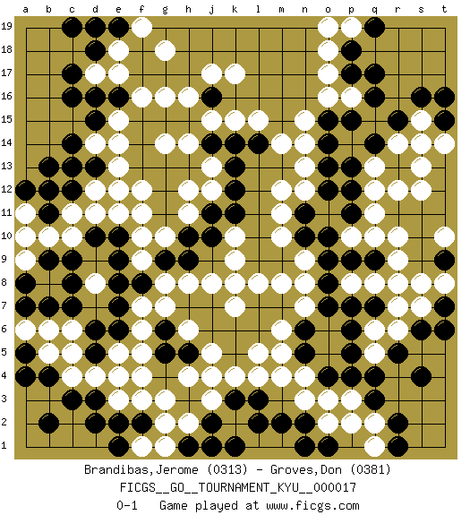 Last move : 0-1 2007 March 24 11:53:13 [Event "FICGS__GO__TOURNAMENT_KYU__000017"] [Site "FICGS"] [Date "2007.01.03"] [Round "1"] [Black "Brandibas,Jerome"] [White "Groves,Don"] [Result "0-1"] [Rating 1 "0313"] [Rating 2 "0381"] 1.q4 c4 2.e4 e3 3.d3 f3 4.c3 d4 5.e2 e5 6.f2 g3 7.b4 c5 8.d6 b5 9.b2 d17 10.c16 f16 11.q16 k17 12.d15 o3 13.a5 a6 14.a4 c6 15.b7 b6 16.c7 f4 17.e6 f6 18.e7 f7 19.e8 o17 20.p17 o16 21.e16 e17 22.c17 r6 23.r5 q6 24.q3 m4 25.f15 g16 26.d18 e18 27.c19 g18 28.e19 f19 29.d19 r14 30.p15 p16 31.p18 o18 32.r15 s15 33.s16 s14 34.q14 q13 35.p13 q12 36.p12 p10 37.p5 q5 38.p6 q8 39.q7 r7 40.p7 p8 41.o4 n4 42.j16 j17 43.s6 r8 44.s4 p3 45.p4 d11 46.n2 n3 47.n5 m5 48.n6 m6 49.m7 n7 50.o7 n8 51.o8 m8 52.l7 l8 53.l6 l5 54.k5 k4 55.j6 j5 56.k6 j8 57.h5 j4 58.g6 g7 59.h7 h8 60.j7 q2 61.r2 q1 62.r1 o2 63.m2 g2 64.l3 l4 65.k3 j3 66.j2 h2 67.o9 m10 68.o10 f9 69.f8 g8 70.e9 f10 71.e10 e11 72.d10 c10 73.c9 b10 74.b9 d8 75.c8 a9 76.a8 a10 77.a7 e14 78.f14 e15 79.d16 d14 80.c14 c13 81.b13 e13 82.p9 q10 83.q9 r9 84.c12 c11 85.d13 d12 86.c13 n14 87.f13 e12 88.g11 f11 89.g9 g10 90.p11 q11 91.g15 h11 92.g12 h12 93.h13 f12 94.g13 h16 95.h15 j15 96.j14 k15 97.k14 j13 98.k13 j12 99.k12 h14 100.d5 e4 101.g5 f5 102.o1 p2 103.h10 g14 104.o15 n15 105.o14 n13 106.o13 n12 107.n11 m11 108.n10 l15 109.k11 k10 110.j10 k9 111.j11 m12 112.o12 s7 113.t7 t8 114.t6 r10 115.t15 t14 116.t16 p19 117.q19 o19 118.q17 k8 119.h9 k7 120.l14 m14 121.k1 h4 122.h1 g1 123.j1 f1 124.d2 n9 125.t9 s8 126.l2 h6 127.n1 r12 128.e1 s12 129.b11 a11 130.b12 s13 131.a12 t10 0-1 Here are the names of the openings (joseki) played in the four corners : Corner d4 : c4 e4 Komoku (Somok, Xiao~mu`) 3-4 Point. The komoku (3-4) point is the traditional corner enclosure move.. Ikken Takagakari (Hankan Nop'dakeolch'im, Yi Gaogua`jiao~, 1-Space High Approach). The 5-4 approach move has become more popular in modern times, as modern Go emphasizes speed and influence. Corner d16 : d17 c16 Komoku (Somok, Xiao~mu`) 3-4 Point. The komoku (3-4) point is the traditional corner enclosure move.. Corner q4 : q4 o3 Hoshi (Hwajeom, Seongjeom, Xingwei`) 4-4 Point. The star or hoshi (4-4) point, emphasizing influence at the potential expense of territory. Ikken Kakari (Hankan Keolch'im, Yi Gua`jiao~, 1-Space Low Approach). White 2 is the standard approach move to the 4-4. Corner q16 : q16 o17 Hoshi (Hwajeom, Seongjeom, Xingwei`) 4-4 Point. The star or hoshi (4-4) point, emphasizing influence at the potential expense of territory. Ikken Kakari (Hankan Keolch'im, Yi Gua`jiao~, 1-Space Low Approach). White 2 is the standard approach move to the 4-4. Player White won this Go (weiqi, baduk) game. Follow this game move after move (download)Keep sente in the opening. A premature attack loses sente. (Anonymous) Good luck. You're gonna need it. (Han Solo in Star Wars ep.6)
