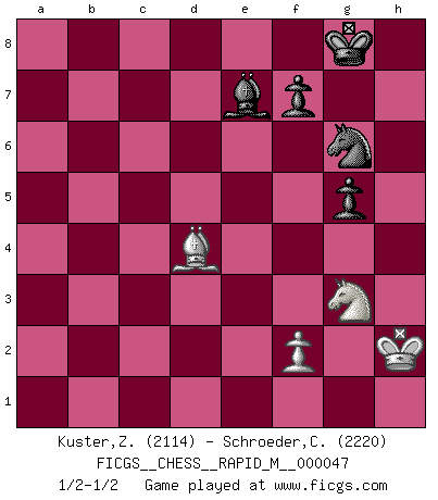 Last move : 1/2-1/2 2011 October 17 9:8:54 [Event "FICGS__CHESS__RAPID_M__000047"] [Site "FICGS"] [Date "2011.09.05"] [Round "1"] [White "Kuster,Zeljko"] [Black "Schroeder,Christoph"] [Result "1/2-1/2"] [WhiteElo "2114"] [BlackElo "2220"] 1.e4 e5 2.Nf3 Nc6 3.Bb5 Nf6 4.d3 d6 5.c3 Be7 6.O-O O-O 7.Re1 Bd7 8.Ba4 a6 9.Nbd2 Re8 10.Nf1 Bf8 11.h3 h6 12.Ng3 b5 13.Bc2 Ne7 14.Nh4 g5 15.Nf3 Ng6 16.Nh2 d5 17.Ng4 Nxg4 18.hxg4 d4 19.Nf5 c5 20.Bd2 Qb6 21.a4 c4 22.Qf3 Rac8 23.axb5 axb5 24.Reb1 Ra8 25.Rxa8 Rxa8 26.dxc4 bxc4 27.b3 cxb3 28.Bxb3 Be6 29.cxd4 exd4 30.Qd1 Qd8 31.g3 d3 32.Kg2 Qd7 33.Bc3 Ra3 34.Nd4 Bxb3 35.Rxb3 Ra4 36.Nf5 Rxe4 37.Qf3 Rc4 38.Bb2 Rxg4 39.Kh2 Rc4 40.Ne3 Rc6 41.Rxd3 Qxd3 42.Qxc6 Qe2 43.Qf6 h5 44.Bd4 h4 45.Nf5 hxg3+ 46.Nxg3 Qe7 47.Qxe7 Bxe7 1/2-1/2 Ruy Lopez : Berlin defense Kingside Castling by player White (move 6) Kingside Castling by player Black (move 6) 10 pieces endgame at move 47 : White KQBNP , Black KBNPP WHITE : King + 1 Queen 1 Bishop 1 Knight 1 Pawn BLACK : King + 1 Bishop 1 Knight 2 Pawns 9 pieces endgame at move 47 : White KBNP , Black KBNPP WHITE : King + 1 Bishop 1 Knight 1 Pawn BLACK : King + 1 Bishop 1 Knight 2 Pawns This chess game ended in a draw. Follow this game move after move (download)You need not play well - just help your opponent to play badly. (Genrikh Chepukaitis) Offensichtlich kennt Kasparow nichts anderes als Schach, und ich könnte 500 weitere Spieler dieser Sorte benennen. (Judith Polgar) Con o sin el título, Bobby Fischer fue sin lugar a dudas el mas grande jugador de su época. (Burt Hochberg) Le génie consiste à savoir transgresser les règles au moment opportun. (Teichmann) I've lost money so fast in these clubs it's left me reeling. I've read every poker book ever written, but the only way to get better at the game is to go out and play with people who are really good. The problem is, you stand to lose a lot of money doing it. (Matt Damon)