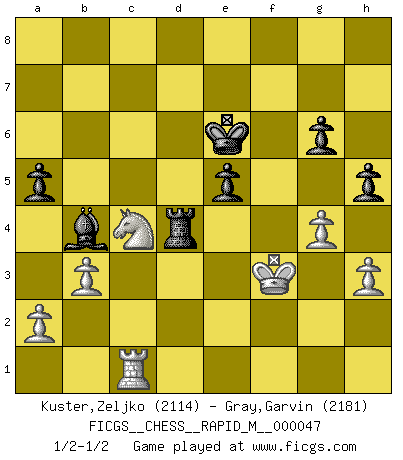 Last move : 1/2-1/2 2011 November 13 18:11:56 [Event "FICGS__CHESS__RAPID_M__000047"] [Site "FICGS"] [Date "2011.09.05"] [Round "1"] [White "Kuster,Zeljko"] [Black "Gray,Garvin"] [Result "1/2-1/2"] [WhiteElo "2114"] [BlackElo "2181"] 1.Nf3 c5 2.e4 Nc6 3.Bb5 e6 4.O-O Qc7 5.c3 a6 6.Bxc6 bxc6 7.d3 Ne7 8.Nbd2 Ng6 9.Nb3 a5 10.Be3 d6 11.e5 c4 12.exd6 Bxd6 13.Nc5 cxd3 14.Qxd3 O-O 15.Rfd1 Rd8 16.Qc2 e5 17.Nd2 Be7 18.Nc4 Rd5 19.Na4 Be6 20.Nd2 c5 21.c4 Rd4 22.b3 f5 23.Nc3 Rad8 24.f3 Qd7 25.Bxd4 cxd4 26.Nd5 Bxd5 27.cxd5 Nf4 28.Nc4 d3 29.Rxd3 Nxd3 30.Qxd3 Bc5+ 31.Kh1 Qxd5 32.Qxd5+ Rxd5 33.Rc1 Kf7 34.g4 fxg4 35.fxg4 Bb4 36.Kg2 Ke6 37.Kf3 Rd3+ 38.Ke4 Rd4+ 39.Kf3 g6 40.h3 h5 1/2-1/2 Reti Opening Kingside Castling by player White (move 4) Kingside Castling by player Black (move 14) This chess game ended in a draw. Follow this game move after move (download)Winning isn't everything... but losing is nothing. (Mednis) Obendrein hat der FIDE-Präsident den Revolutionsführer Gaddafi zum »Großmeister« ernannt, am Ende der WM. Das ist lächerlich! (Joel Lautier) Dios mío, Bobby Fischer juega tan simple. (Alexei Suetin) Il (Jacob Murray) ne joue pas pour le bon coup, mais pour le meilleur. (Eloi Relange) Man is reluctant to give credit for intelligence to anyone, except his enemies. (Albert Einstein)