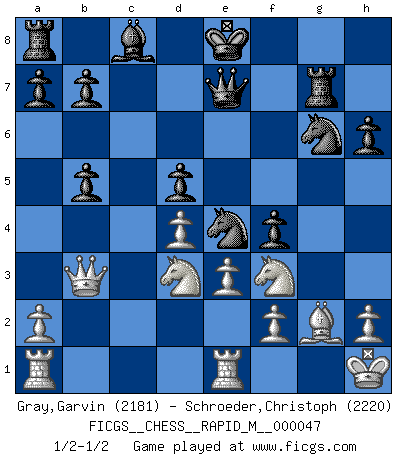 Last move : 1/2-1/2 2011 November 1 16:24:47 [Event "FICGS__CHESS__RAPID_M__000047"] [Site "FICGS"] [Date "2011.09.05"] [Round "1"] [White "Gray,Garvin"] [Black "Schroeder,Christoph"] [Result "1/2-1/2"] [WhiteElo "2181"] [BlackElo "2220"] 1.c4 e6 2.Nf3 f5 3.d4 Nf6 4.g3 d5 5.Bg2 c6 6.O-O Bd6 7.Bf4 Bxf4 8.gxf4 Nbd7 9.Nbd2 h6 10.e3 g5 11.Re1 Rg8 12.cxd5 exd5 13.Ne5 Qe7 14.Nd3 Nf8 15.fxg5 Rxg5 16.Nf3 Rg7 17.b4 Ng6 18.Kh1 Ne4 19.Qc2 f4 20.b5 cxb5 21.Qb3 1/2-1/2 English Opening Kingside Castling by player White (move 6) This chess game ended in a draw. Follow this game move after move (download)Who is your opponent tonight, tonight I am playing against the Black pieces. (Akiba Rubinstein) Zum Sieg gelangt man nicht, wenn man gut, sondern nur wenn man besser spielt (Savielly Grigorievitsch Tartakower) En partidas rápidas, el Caballo es mas poderoso que el Alfil. (Vlastimil Hort) Je menace de comprendre la position. (Anonyme) The weakness of an artist is dogma. (Josh Waitzkin)