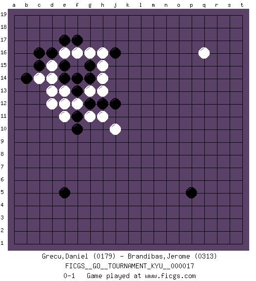 Last move : 0-1 2007 February 27 18:1:7 [Event "FICGS__GO__TOURNAMENT_KYU__000017"] [Site "FICGS"] [Date "2007.01.03"] [Round "1"] [Black "Grecu,Daniel"] [White "Brandibas,Jerome"] [Result "0-1"] [Rating 1 "0179"] [Rating 2 "0313"] 1.d16 q16 2.e5 f16 3.p5 d15 4.e15 e16 5.c15 d14 6.e14 c14 7.c16 e13 8.f14 g13 9.f13 f12 10.e12 d13 11.g14 e11 12.b14 d12 13.g12 h13 14.h12 h14 15.f11 e12 16.g15 h16 17.j16 h15 18.e17 g16 19.f17 g11 20.f10 h11 21.j12 j10 0-1 This go game has been lost on time (started : 2007.01.03 1:56:3) Here are the names of the openings (joseki) played in the four corners : Corner d16 : d16 f16 Hoshi (Hwajeom, Seongjeom, Xingwei`) 4-4 Point. The star or hoshi (4-4) point, emphasizing influence at the potential expense of territory. Ikken Takagakari (Hankan Nop'dakeolch'im, Yi Gaojia, 1-Space High Approach). Black typically responds at 6-4 or 3-10. Black 4-10 is played when Black finds play on the right side advantageous. Black 4-8 or 3-8 may be played when Black has support at top. Player White won this Go (weiqi, baduk) game. Follow this game move after move (download)Error is one of the sources of transformation. (Pierre Audouard) There are more things in heaven and earth than practically anywhere else. (Unknown)