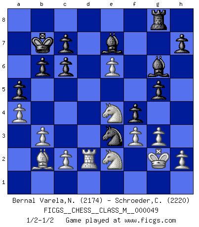 Last move : 1/2-1/2 2011 November 30 14:51:12 [Event "FICGS__CHESS__CLASS_M__000049"] [Site "FICGS"] [Date "2011.09.06"] [Round "1"] [White "Bernal Varela,Nelson"] [Black "Schroeder,Christoph"] [Result "1/2-1/2"] [WhiteElo "2174"] [BlackElo "2220"] 1.e4 e5 2.Nf3 Nc6 3.Bb5 Nf6 4.O-O Nxe4 5.d4 Nd6 6.Bxc6 dxc6 7.dxe5 Nf5 8.Qxd8+ Kxd8 9.Nc3 Bd7 10.Rd1 Kc8 11.a4 a5 12.Ng5 Be8 13.b3 b6 14.Bb2 Be7 15.Nge4 Kb7 16.Rd3 Rd8 17.Rxd8 Bxd8 18.Rd1 Be7 19.f3 f6 20.Ne2 Ne3 21.Rd2 f5 22.N4g3 g5 23.e6 Rg8 24.Kf2 f4 25.Ne4 Bg6 26.g3 Ng4+ 27.Kg2 Ne3+ 1/2-1/2 Ruy Lopez : Berlin defense, Open variation Kingside Castling by player White (move 4) This chess game ended in a draw. Follow this game move after move (download)Excellence at Chess is one mark of a scheming mind. (Sir Arthur Conan Doyle) Jeder Fehler erscheint unglaublich dumm, wenn andre ihn begehen. (Georg Christoph Lichtenberg) Coloca el contenido del tablero de Ajedrez en un sombrero, agita las piezas vigorosamente, derrámalas en el tablero desde una altura de medio metro y así obtienes el estilo de Wilhelm Steinitz. (H. E. Bird) J'apprécie les joueurs d'est-indienne, c'est grâce à eux que je nourris ma famille depuis tant d'années. (Petrosian) There are more things in heaven and earth than practically anywhere else. (Unknown)