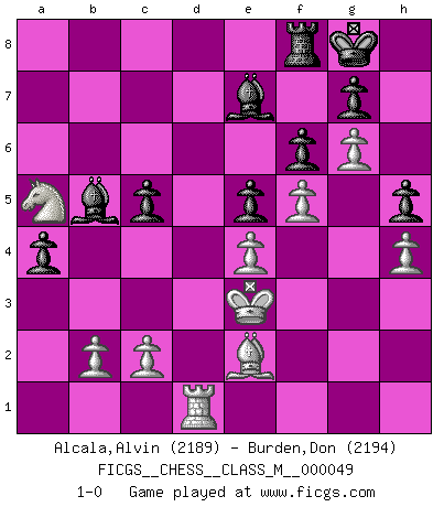 Last move : 1-0 2012 July 30 23:33:53 [Event "FICGS__CHESS__CLASS_M__000049"] [Site "FICGS"] [Date "2011.09.06"] [Round "1"] [White "Alcala,Alvin"] [Black "Burden,Don"] [Result "1-0"] [WhiteElo "2189"] [BlackElo "2194"] 1.e4 c5 2.Nf3 d6 3.d4 cxd4 4.Nxd4 Nf6 5.Nc3 a6 6.Bg5 Nbd7 7.f4 Qc7 8.Qf3 b5 9.O-O-O e6 10.a3 Rb8 11.f5 e5 12.Nb3 b4 13.axb4 Rxb4 14.Bxf6 Nxf6 15.g4 Bb7 16.Bd3 Be7 17.g5 Nd7 18.h4 Bc6 19.Rhg1 a5 20.Nd2 a4 21.Nc4 h5 22.Be2 Nb6 23.Na3 Bd7 24.Rgf1 Qc5 25.Nd5 Rb3 26.Qf2 Rxa3 27.Qxc5 Ra1+ 28.Kd2 Rxd1+ 29.Rxd1 dxc5 30.Nxb6 Bc6 31.Ke3 f6 32.Nc4 O-O 33.g6 Bb5 34.Na5 1-0 Sicilian : Najdorf, 6.Bg5 Queenside Castling by player White (move 9) Kingside Castling by player Black (move 32) Player White won this chess game. Follow this game move after move (download)Many Chess players were surprised when after the game, Fischer quietly explained: 'I had already analyzed this possibility' in a position which I thought was not possible to foresee from the opening. (Mikhail Tal) Die größte Kunst beim Schach besteht darin dem Gegner nicht zu zeigen was er tun kann. (Garry Kasparov) Una victoria por una combinación errónea, aunque sea espectacular, me llena de horror artístico. (Wilhelm Steinitz) Tout change constamment, y compris dans le monde des Echecs. (Botvinnik) In every real man a child is hidden that wants to play. (Friedrich Nietzsche)