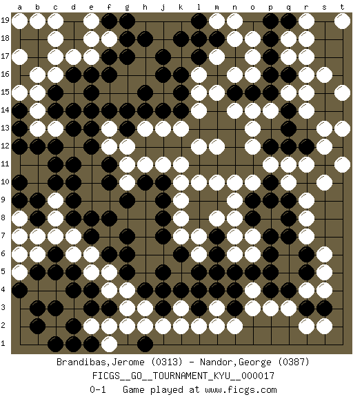 Last move : 0-1 2007 April 12 18:53:11 [Event "FICGS__GO__TOURNAMENT_KYU__000017"] [Site "FICGS"] [Date "2007.01.03"] [Round "1"] [Black "Brandibas,Jerome"] [White "Nandor,George"] [Result "0-1"] [Rating 1 "0313"] [Rating 2 "0387"] 1.q4 d3 2.d5 c7 3.c3 c2 4.b3 g3 5.e3 c16 6.d2 k3 7.l4 m3 8.l3 l2 9.n3 n2 10.m4 m2 11.j3 j4 12.k4 k2 13.h4 j2 14.j5 h3 15.j4 q17 16.p16 r15 17.q16 r16 18.p17 q18 19.p18 q10 20.q12 r7 21.q8 r8 22.r10 r9 23.q9 r11 24.r12 q11 25.q7 k17 26.c11 c9 27.d8 c8 28.c6 b6 29.b5 b7 30.d10 b11 31.c10 b10 32.b12 d6 33.c5 d7 34.d9 a12 35.a13 a11 36.b9 f7 37.e7 e6 38.e8 f5 39.g6 e17 40.f6 e5 41.e4 f4 42.f3 g4 43.g7 b13 44.a10 c13 45.d13 k10 46.g9 o10 47.c14 b14 48.c15 b15 49.d16 d15 50.d14 d17 51.e15 g16 52.a14 b16 53.e16 a15 54.a12 o12 55.n11 n10 56.n12 o13 57.o11 p11 58.p12 p14 59.s11 s10 60.t12 l12 61.n13 n14 62.l13 f13 63.f14 g14 64.e13 f15 65.e14 f12 66.f16 g15 67.f17 f18 68.g17 h17 69.g18 e18 70.h18 d12 71.j17 h16 72.j16 j13 73.e12 c18 74.c12 l15 75.k16 l16 76.l17 n16 77.k18 j15 78.k15 l14 79.j14 h13 80.h15 g10 81.f11 g11 82.d11 n18 83.o15 o14 84.m14 m15 85.m13 k13 86.m11 m10 87.l11 k11 88.p9 l10 89.n15 o16 90.p15 q15 91.q14 m12 92.q19 r19 93.h14 r14 94.q13 s13 95.g13 g12 96.g14 t13 97.f19 e19 98.g19 k7 99.k6 o7 100.p6 o6 101.o8 n8 102.o9 n9 103.p5 o3 104.n4 q3 105.r3 p3 106.o5 l6 107.j7 k8 108.j8 r4 109.r5 s4 110.s3 s5 111.r6 s6 112.p4 r2 113.p19 r18 114.f10 m17 115.l18 o18 116.m18 o17 117.h10 h11 118.j10 j11 119.j9 k9 120.l5 e2 121.d4 f2 122.c1 g2 123.g5 n6 124.m6 l7 125.m7 m8 126.n5 n7 127.m5 a8 128.b8 a7 129.a9 m19 130.l19 n19 131.p7 a5 132.a4 a6 133.e1 f1 134.d1 s2 135.b2 s12 136.k14 o4 137.p10 t11 138.b17 c17 139.s17 s16 140.s18 r17 141.t16 t15 142.b18 a17 143.a18 b19 144.a16 c19 145.h1 h2 146.f8 a17 147.s19 a19 148.t17 t19 149.t18 t19 0-1 Here are the names of the openings (joseki) played in the four corners : Corner d4 : d3 d5 Komoku (Somok, Xiao~mu`) 3-4 Point. The komoku (3-4) point is the traditional corner enclosure move.. Ikken Takagakari (Hankan Nop'dakeolch'im, Yi Gaogua`jiao~, 1-Space High Approach). The 5-4 approach move has become more popular in modern times, as modern Go emphasizes speed and influence. Corner q16 : q17 p16 Komoku (Somok, Xiao~mu`) 3-4 Point. The komoku (3-4) point is the traditional corner enclosure move.. Corner d16 : c16 c11 Komoku (Somok, Xiao~mu`) 3-4 Point. The komoku (3-4) point is the traditional corner enclosure move.. Player White won this Go (weiqi, baduk) game. Follow this game move after move (download)Capture what you cut off. (Anonymous) If you work for a living, why do you kill yourself working ? (Tuco to a chicken in The Good, The Bad and The Ugly)