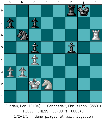Last move : 1/2-1/2 2012 January 11 23:3:4 [Event "FICGS__CHESS__CLASS_M__000049"] [Site "FICGS"] [Date "2011.09.06"] [Round "1"] [White "Burden,Don"] [Black "Schroeder,Christoph"] [Result "1/2-1/2"] [WhiteElo "2194"] [BlackElo "2220"] 1.e4 e5 2.Nf3 Nc6 3.d4 exd4 4.Nxd4 Nf6 5.Nxc6 bxc6 6.e5 Qe7 7.Qe2 Nd5 8.c4 Ba6 9.b3 g6 10.Ba3 Nb4 11.Bb2 Bg7 12.a3 Nd5 13.Nd2 O-O 14.O-O-O Rab8 15.Kc2 Nb6 16.f4 c5 17.h4 Bb7 18.h5 d6 19.Re1 Rbd8 20.f5 dxe5 21.fxg6 fxg6 22.hxg6 hxg6 23.Bxe5 Bc8 24.g4 Bxe5 25.Qxe5 Qxe5 26.Rxe5 Bxg4 27.Bd3 Bf5 28.Bxf5 Rxf5 29.Rxf5 gxf5 30.Rh5 Rf8 31.Rh6 1/2-1/2 Scotch : Mieses variation Kingside Castling by player Black (move 13) Queenside Castling by player White (move 14) This chess game ended in a draw. Follow this game move after move (download)It is no time to be playing Chess when the house is on fire. (Italian Proverb) Charakterschwächen offenbaren sich normalerweise während einer Schachpartie. (Garry Kasparov) El Ajedrez es un cuento de Hadas de las 1001 metidas de pata. (Savielly Tartakower) Ce qui caractérise les parties de combat, c'est que si le défenseur a constamment de difficiles problèmes à résoudre, l'attaquant doit chercher sans relâche de nouvelles possibilités d'attaque. (Koblentz) True nature is revealed in times of difficulty. (Chinese proverb)