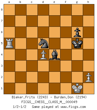 Last move : 1/2-1/2 2012 June 7 15:29:26 [Event "FICGS__CHESS__CLASS_M__000049"] [Site "FICGS"] [Date "2011.09.06"] [Round "1"] [White "Bleker,Frits"] [Black "Burden,Don"] [Result "1/2-1/2"] [WhiteElo "2243"] [BlackElo "2194"] 1.d4 Nf6 2.c4 e6 3.Nf3 b6 4.g3 Ba6 5.b3 d5 6.Bg2 Bb4+ 7.Bd2 Be7 8.cxd5 exd5 9.O-O O-O 10.Nc3 Re8 11.Ne5 Bb7 12.Rc1 Nbd7 13.Bf4 Nf8 14.Qd3 Ne6 15.Be3 Bb4 16.f4 c6 17.Bf2 Qe7 18.Rfd1 Rac8 19.e3 h6 20.Be1 c5 21.Nb5 Bxe1 22.Rxe1 Ba6 23.a4 cxd4 24.exd4 Qb4 25.Rcd1 Re7 26.Re3 Rec7 27.Nxf7 Kxf7 28.Bxd5 Nxd5 29.Qf5+ Nf6 30.Qxe6+ Kg6 31.Nxc7 Rxc7 32.g4 Bc8 33.Qe5 Rc3 34.g5 Qxb3 35.Rde1 Rxe3 36.Qxe3 Qxe3+ 37.Rxe3 hxg5 38.fxg5 Kxg5 39.Re7 g6 40.Rxa7 Bf5 41.Ra6 Nd5 42.a5 bxa5 43.Rxa5 Be4 1/2-1/2 Queen's Indian : Nimzovich variation (exaggerated Fianchetto) Kingside Castling by player White (move 9) Kingside Castling by player Black (move 9) 10 pieces endgame at move 40 : White KRPPP , Black KBNPP WHITE : King + 1 Rook 3 Pawns BLACK : King + 1 Bishop 1 Knight 2 Pawns 9 pieces endgame at move 42 : White KRPP , Black KBNPP WHITE : King + 1 Rook 2 Pawns BLACK : King + 1 Bishop 1 Knight 2 Pawns 8 pieces endgame at move 43 : White KRPP , Black KBNP WHITE : King + 1 Rook 2 Pawns BLACK : King + 1 Bishop 1 Knight 1 Pawn This chess game ended in a draw. Follow this game move after move (download)It is always better to sacrifice your opponent's men. (Savielly Tartakower) Obwohl ich alt bin, darf mir niemand den Finger in den Mund stecken, sonst beisse ich. (Wilhelm Steinitz) Yo tuve un dolor de muelas en la primer partida. En el segundo juego, tuve un dolor de cabeza. En el tercero, tuve un ataque de reumatísmo. En la cuarta partida, no me sentía muy bien. ¿Y en el quinto juego? Bueno, ¿que acaso uno tiene que ganar todos los juegos?. (Siegbert Tarrasch) Même un GMI sait rarement calculer sur plus de cinq coups une attaque à sacrifices. (Rudolf Spielmann) The Internet is the world's largest library. It's just that all the books are on the floor. (John Allen Paulos)