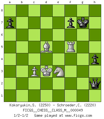 Last move : 1/2-1/2 2012 March 3 0:56:2 [Event "FICGS__CHESS__CLASS_M__000049"] [Site "FICGS"] [Date "2011.09.06"] [Round "1"] [White "Kokoryukin,Sergey"] [Black "Schroeder,Christoph"] [Result "1/2-1/2"] [WhiteElo "2250"] [BlackElo "2220"] 1.d4 d5 2.c4 e6 3.Nc3 c5 4.cxd5 cxd4 5.Qa4+ Bd7 6.Qxd4 exd5 7.Qxd5 Nf6 8.Qxb7 Nc6 9.Bf4 Bb4 10.g3 O-O 11.Bh3 Bxc3+ 12.bxc3 Qa5 13.Rb1 Qd5 14.f3 Rab8 15.Bxb8 Rxb8 16.Qxb8+ Nxb8 17.Rxb8+ Be8 18.e4 Qxa2 19.Ne2 Qa1+ 20.Kd2 Qxh1 21.e5 Qxf3 22.exf6 Qd5+ 23.Nd4 Kf8 24.fxg7+ Kxg7 25.Rxe8 Qa2+ 26.Kd3 Qxh2 27.Nf5+ Kf6 28.Bg4 Qg1 29.Ne3 Qxg3 30.Re4 Kg7 31.Kd2 Kg6 32.Bf5+ Kf6 33.Rg4 Qf2+ 34.Kd3 h5 35.Be4 Qh2 36.Rf4+ Kg7 37.Rf5 h4 38.Bd5 1/2-1/2 QGD : Tarrasch, von Hennig-Schara gambit Kingside Castling by player Black (move 10) 10 pieces endgame at move 29 : White KRBNP , Black KQPPP WHITE : King + 1 Rook 1 Bishop 1 Knight 1 Pawn BLACK : King + 1 Queen 3 Pawns This chess game ended in a draw. Follow this game move after move (download)A passed Pawn increases in strength as the number of pieces on the board diminishes. (Capablanca) Obwohl ich vom Stil her kaum zu den Priestern der Schachkunst gezählt werde, halte ich Schach doch für eine Kunst. (Tigran Petrosjan) Aquellos que dicen que entienden al Ajedrez, no entienden nada. (Robert Hubner) La menace est plus forte que l'exécution. (Aaron Nimzovitch) The question of whether computers can think is just like question of whether submarines can swim. (Edsger W. Dijkstra)
