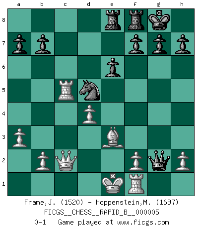 Last move : 0-1 2006 June 5 2:5:59 [Event "FICGS__CHESS__RAPID_B__000005"] [Site "FICGS"] [Date "2006.05.10"] [Round "1"] [White "Frame,Jeremy"] [Black "Hoppenstein,Michael"] [Result "0-1"] [WhiteElo "1520"] [BlackElo "1697"] 1.e4 c5 2.Nf3 d6 3.c3 Nf6 4.e5 dxe5 5.Nxe5 Qd5 6.d4 cxd4 7.cxd4 Nc6 8.Nxc6 Qxc6 9.Nc3 Bd7 10.Bb5 Qxg2 11.Bxd7+ Nxd7 12.Rf1 e6 13.Be3 Bb4 14.Rc1 O-O 15.a3 Bxc3+ 16.Rxc3 Nf6 17.Qc2 Nd5 18.Rc5 Rae8 0-1 Sicilian Kingside Castling by player Black (move 14) Player Black won this chess game. Follow this game move after move (download)Winning isn't everything... but losing is nothing. (Mednis) Besser ein falscher Plan, logisch durchgeführt, als gar kein Plan. (Viktor Kortschnoi) Tu no necesitas jugar muy bien, únicamente ayudar a tu oponenet a que juegue muy mal. (Genrikh Chepukaitis) Je ne crois pas en la psychologie, je crois aux bons coups. (Robert Fischer) A belief is an idea the mind possesses, an idea that possesses the mind. (Robert Oxden Bolton)