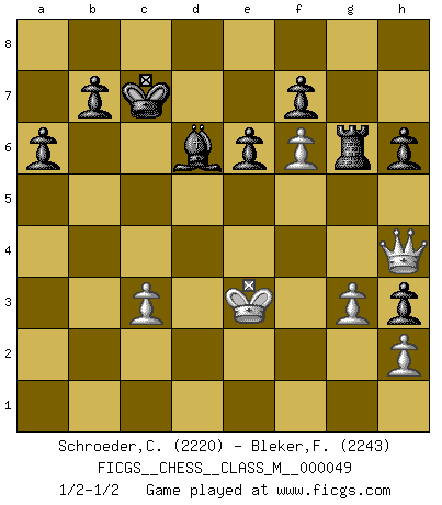 Last move : 1/2-1/2 2011 December 25 21:52:56 [Event "FICGS__CHESS__CLASS_M__000049"] [Site "FICGS"] [Date "2011.09.06"] [Round "1"] [White "Schroeder,Christoph"] [Black "Bleker,Frits"] [Result "1/2-1/2"] [WhiteElo "2220"] [BlackElo "2243"] 1.e4 c5 2.Nf3 d6 3.d4 cxd4 4.Nxd4 Nf6 5.Nc3 a6 6.Bg5 e6 7.f4 Qb6 8.Qd2 Qxb2 9.Rb1 Qa3 10.e5 h6 11.Bh4 dxe5 12.fxe5 g5 13.exf6 gxh4 14.Ne4 Qxa2 15.Rd1 Bd7 16.Be2 Qd5 17.Qe3 Qa5+ 18.c3 Nc6 19.O-O Nxd4 20.Rxd4 O-O-O 21.Rb1 Rg8 22.Bf3 Bb5 23.Rxd8+ Qxd8 24.Qa7 Bc6 25.Rd1 Qxd1+ 26.Bxd1 Bxe4 27.Kf2 Kc7 28.Bf3 Bxf3 29.Kxf3 Bd6 30.Qd4 h3 31.g3 Rg5 32.Qh4 Rg6 33.Ke3 1/2-1/2 Sicilian : Najdorf, 7...Qb6 Kingside Castling by player White (move 19) Queenside Castling by player Black (move 20) This chess game ended in a draw. Follow this game move after move (download)Daring ideas are like Chess men moved forward. They may be beaten, but they may start a winning game. (Johann Wolfgang von Goethe) Schach sollte überall auf der Welt Schulfach werden. Es fördert die geistige Auseinandersetzung. Es lehrt die Demut in der Niederlage. (Garry Kasparov) Cuando estes solo, cuando te sientas un extraño en el mundo, juega al Ajedrez. Esto levantará tu espiritu y será tu consejero de guerra. (Aristóteles) Plusieurs personnes se sont demandées comment Tal faisait pour gagner... En fait, c'est très simple ! Il met ses pièces au centre de l'échiquier et les sacrifie quelque part ! (David Bronstein) All politicians must be presumed guilty until they are proven innocent. (Dinesh De Silva)