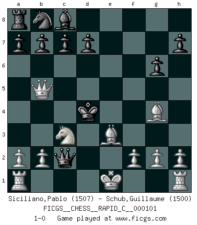 Last move : 1-0 2011 October 4 2:24:22 [Event "FICGS__CHESS__RAPID_C__000101"] [Site "FICGS"] [Date "2011.09.07"] [Round "1"] [White "Siciliano,Pablo"] [Black "Schub,Guillaume"] [Result "1-0"] [WhiteElo "1507"] [BlackElo "1500"] 1.e4 e5 2.Nf3 f6 3.Nxe5 fxe5 4.Qh5+ g6 5.Qxe5+ Qe7 6.Qxh8 Nf6 7.d3 Nxe4 8.dxe4 Qxe4+ 9.Be2 Qxc2 10.Bh6 Ke7 11.Qxf8+ Ke6 12.Bg4+ Kd5 13.Nc3+ Kc4 14.Qf4+ Kc5 15.Qe5+ Kc4 16.Qb5+ Kd4 17.Be3+ 1-0 Damiano's defense Player White won this chess game. Follow this game move after move (download)A Chess game is divided into three stages: the first, when you hope you have the advantage, the second when you believe you have an advantage, and the third... when you know you're going to lose ! (Savielly Tartakower) Verschiedene, sehr schätzbare und im Laufe des Lebens nützliche Eigenschaften des Geistes können durch das Schachspiel erworben und gekräftigt werden, so dass sie zu Gewohnheiten werden, die uns nie im Stich lassen. (Benjamin Franklin) Cuando tu no sabes absolutamente que mas hacer, es tiempo de entrar en pánico. (John van der Wiel) L'attaque fait le spectacle, la défense gagne les matchs. (Dicton footballistique) History is a gallery of pictures in which there are few originals and many copies. (Alexis de Tocqueville)