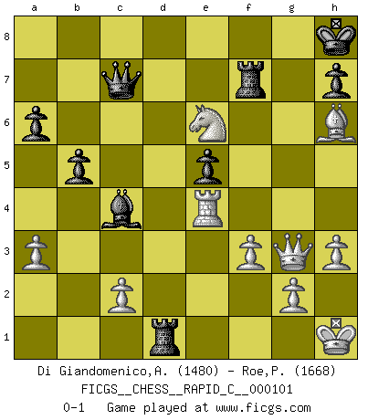 Last move : 0-1 2011 November 7 13:54:33 [Event "FICGS__CHESS__RAPID_C__000101"] [Site "FICGS"] [Date "2011.09.07"] [Round "1"] [White "Di Giandomenico,Alfonso"] [Black "Roe,Philip"] [Result "0-1"] [WhiteElo "1480"] [BlackElo "1668"] 1.e4 c5 2.Nf3 e6 3.d4 cxd4 4.Nxd4 a6 5.Nc3 Qc7 6.Bd3 b5 7.a3 Bb7 8.Be3 Nf6 9.O-O d6 10.Kh1 Be7 11.f3 O-O 12.Qe1 d5 13.exd5 Nxd5 14.Nxd5 Bxd5 15.Ne2 Nd7 16.Bf4 Qb7 17.Qg3 Nc5 18.Bh6 Bf6 19.Nf4 Nxd3 20.Nxd3 Bc4 21.Nf4 Bxb2 22.Rab1 Be5 23.Rfe1 f6 24.Rxe5 fxe5 25.Nh5 Rf7 26.Re1 Rd8 27.h3 Rd5 28.Re4 Qc7 29.Nxg7 Kh8 30.Nxe6 Rd1+ 0-1 Sicilian : Kan, 5.Nc3 Kingside Castling by player White (move 9) Kingside Castling by player Black (move 11) Player Black won this chess game. Follow this game move after move (download)There is only one thing Fischer does in Chess without pleasure: to lose ! (Boris Spassky) Fallen sollten polizeilich verboten werden. (Savielly Grigorievitsch Tartakower) El Ajedrez es un juego de pelea el cual es puramente intelectual e incluye la suerte. (Richard Reti) Votre seul travail dans les ouvertures est d'obtenir un milieu de partie jouable. (Lajos Portish) Some people are so afraid to die that they never begin to live. (Henry Van Dyke)