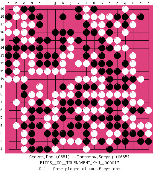 Last move : 0-1 2007 March 22 9:10:13 [Event "FICGS__GO__TOURNAMENT_KYU__000017"] [Site "FICGS"] [Date "2007.01.03"] [Round "1"] [Black "Groves,Don"] [White "Tarassov,Sergey"] [Result "0-1"] [Rating 1 "0381"] [Rating 2 "0665"] 1.q3 c16 2.d4 q16 3.r6 c6 4.d6 d7 5.d5 c5 6.e7 d8 7.e17 d13 8.h16 n16 9.l17 r13 10.k4 r9 11.c11 e11 12.c14 c13 13.d14 b14 14.d16 c17 15.b15 b16 16.b13 b12 17.a14 b11 18.c19 c3 19.c4 b4 20.d3 c2 21.d2 b18 22.d18 c18 23.d19 b19 24.a18 a17 25.e15 n4 26.o6 m6 27.n5 m4 28.m5 l5 29.l4 p3 30.p4 o3 31.k5 l6 32.o4 m3 33.p2 o2 34.q2 k2 35.k7 n7 36.o7 n8 37.m7 m8 38.l7 n6 39.o5 o8 40.l14 m17 41.l16 k10 42.c9 e9 43.c8 b7 44.l3 m2 45.l2 l1 46.h3 h2 47.j3 j2 48.g2 k6 49.j6 g3 50.g4 f2 51.f3 g1 52.g3 e2 53.d1 c1 54.e1 j5 55.h6 g6 56.h7 f7 57.f6 e8 58.e6 g7 59.n2 e3 60.e4 g5 61.h5 r7 62.q7 s7 63.s6 q8 64.h18 q6 65.p7 q5 66.q4 r4 67.r3 s4 68.s3 t3 69.o1 j13 70.m16 n17 71.n15 o15 72.n14 n12 73.o14 p14 74.p13 q14 75.o12 o11 76.p11 q11 77.n11 m11 78.o10 n10 79.o11 l12 80.h9 j8 81.k8 h8 82.j7 j9 83.p9 p8 84.q10 r11 85.n13 m10 86.m12 m13 87.n12 j15 88.j16 f14 89.f15 g15 90.g16 g14 91.l13 k12 92.k15 l18 93.k18 l19 94.k19 n18 95.h15 j14 96.h14 h13 97.q12 r12 98.t2 t4 99.s2 r5 100.q17 r17 101.o16 p15 102.o17 o18 103.q18 r18 104.m19 m18 105.p18 p17 106.s18 q19 107.c12 b10 108.e13 d12 109.e12 d11 110.f12 f11 111.g12 h11 112.g13 g11 113.e14 h12 114.f13 l8 115.k9 g8 116.l9 l10 117.m9 n9 118.j4 f5 119.a12 c10 120.r10 s10 121.q9 r8 122.p5 t6 123.a11 a10 124.a13 a16 125.b14 c15 126.o9 f4 127.f1 d17 128.e18 d15 0-1 Here are the names of the openings (joseki) played in the four corners : Corner d4 : d4 c6 Hoshi (Hwajeom, Seongjeom, Xingwei`) 4-4 Point. The star or hoshi (4-4) point, emphasizing influence at the potential expense of territory. Ikken Kakari (Hankan Keolch'im, Yi Gua`jiao~, 1-Space Low Approach). White 2 is the standard approach move to the 4-4. Corner d16 : c16 e17 Komoku (Somok, Xiao~mu`) 3-4 Point. The komoku (3-4) point is the traditional corner enclosure move.. Ikken Kakari (Hankan Keolch'im, Yi Gua`jiao~, 1-Space Low Pincer). The small knight move is the basic approach move to the 3-4 point stone. It has been continually used for over four centuries. There are limitless variations, with new moves constantly being discovered. Black 2 opens the door to a treaure store of joseki. Player White won this Go (weiqi, baduk) game. Follow this game move after move (download)The weak player fears ko, the strong player seeks it. (Bill Taylor) The absolute truth is the thing that makes people laugh. (Carl Reiner)