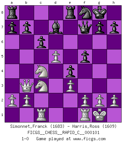 Last move : 1-0 2011 September 28 9:0:15 [Event "FICGS__CHESS__RAPID_C__000101"] [Site "FICGS"] [Date "2011.09.07"] [Round "1"] [White "Simonnet,Franck"] [Black "Harris,Ross"] [Result "1-0"] [WhiteElo "1683"] [BlackElo "1609"] 1.d4 d5 2.c4 e6 3.Nc3 Nf6 4.cxd5 exd5 5.Bg5 Be7 6.e3 Nbd7 7.Nf3 O-O 8.Bd3 c6 9.O-O Re8 10.Qc2 Nf8 11.Rac1 Ne4 12.Bxe7 Qxe7 13.Bxe4 dxe4 14.Nd2 f5 15.d5 Bd7 16.Qb3 Qf7 17.Nc4 1-0 QGD : Exchange, positional line Kingside Castling by player Black (move 7) Kingside Castling by player White (move 9) Player White won this chess game. Follow this game move after move (download)The game of chess is the touchstone of the intellect. (Goethe) Dieses schreckliche Gefühl, dass ich gegen eine Maschine spielte, die niemals Fehler macht, zerschmetterte meinen Widerstand. (Mark Taimanov) No solamente yo pronostico su triunfo sobre Botvinnik, sino que me adelanto y digo que probablemente Fischer es el jugador de Ajedrez mas grande que haya existido. (John Collins) Je menace de comprendre la position. (Anonyme) The ultimate in disposing one's troops is to be without ascertainable shape. Then the most penetrating spies cannot pry in nor can the wise lay plans against you. (Sun Tzu)