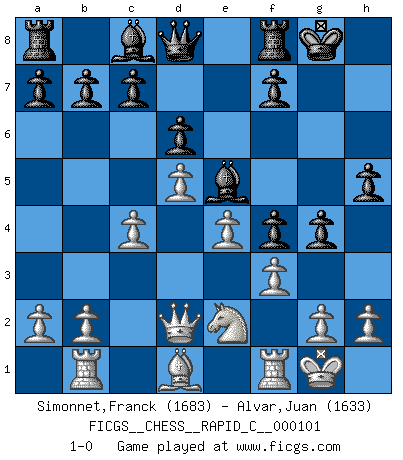 Last move : 1-0 2011 November 14 0:44:40 [Event "FICGS__CHESS__RAPID_C__000101"] [Site "FICGS"] [Date "2011.09.07"] [Round "1"] [White "Simonnet,Franck"] [Black "Alvar,Juan"] [Result "1-0"] [WhiteElo "1683"] [BlackElo "1633"] 1.d4 Nf6 2.c4 g6 3.Nc3 Bg7 4.Nf3 O-O 5.e4 d6 6.Be2 Nbd7 7.O-O e5 8.d5 h6 9.Qc2 Nh5 10.Rb1 Nf4 11.Bxf4 exf4 12.Qd2 g5 13.Nd4 Ne5 14.Nf3 Nxf3+ 15.Bxf3 g4 16.Bd1 Be5 17.f3 h5 18.Ne2 1-0 This chess game has been lost on time (started : 2011.09.07 0:18:26) King's Indian defense, 3.Nc3 Kingside Castling by player Black (move 4) Kingside Castling by player White (move 7) Player White won this chess game. Follow this game move after move (download)White lost because he failed to remember the right continuation and had to think up the moves himself. (Siegbert Tarrasch) Sitze auf Deine Hände. (Siegbert Tarrasch) En la vida, como en el Ajedrez, los Peones propios obstruyen nuestro camino. La gran fortuna de un hombre, su comodidad, placer, hijos, libros, que deberían ayudarle a ganar, con mucha frecuencia lo ponen en Jaque Mate. (Charles Buxton) Même si vous avez un bon coup à faire, regardez toujours s'il n'y en a pas un qui lui soit préférable. (Pedro Damiano) Somehow our devils are never quite what we expect when we meet them face to face. (Nelson DeMille)