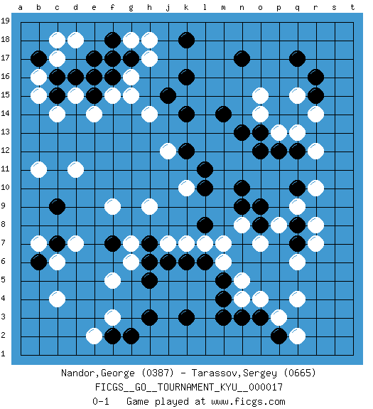 Last move : 0-1 2007 February 9 6:18:52 [Event "FICGS__GO__TOURNAMENT_KYU__000017"] [Site "FICGS"] [Date "2007.01.03"] [Round "1"] [Black "Nandor,George"] [White "Tarassov,Sergey"] [Result "0-1"] [Rating 1 "0387"] [Rating 2 "0665"] 1.q17 c4 2.c16 q4 3.r15 c14 4.e17 d11 5.q10 r7 6.k3 f3 7.o3 p3 8.k16 g16 9.g17 d7 10.h3 r12 11.q12 r10 12.q8 r8 13.q7 q6 14.n17 q13 15.p12 p13 16.o13 r14 17.o12 q15 18.r16 o15 19.h5 f5 20.h7 k10 21.m14 o14 22.n13 m7 23.e15 h14 24.m3 o7 25.p2 q2 26.f2 e2 27.g2 e14 28.k14 j12 29.n10 h9 30.l11 n4 31.n3 o4 32.k12 h17 33.f7 f9 34.c9 b11 35.c7 c6 36.l6 k7 37.k6 m6 38.m5 n5 39.m4 j7 40.j6 g6 41.b6 b7 42.h6 g7 43.l8 l7 44.l10 g18 45.f17 f15 46.f16 g15 47.f18 h18 48.k18 b16 49.b17 b15 50.c15 d15 51.e16 c17 52.d16 c18 53.j15 d18 54.o8 n8 55.n9 p8 56.o9 q9 0-1 Here are the names of the openings (joseki) played in the four corners : Corner d16 : c16 c14 Komoku (Somok, Xiao~mu`) 3-4 Point. The komoku (3-4) point is the traditional corner enclosure move.. Player White won this Go (weiqi, baduk) game. Follow this game move after move (download)Studying go is a wonderful way to develop both the creative as well as the logical abilities of children because to play it both sides of the brain are necessary. (Cho Chikun) To err is human, but to really foul things up requires a computer. (Farmer's Almanac, 1978)