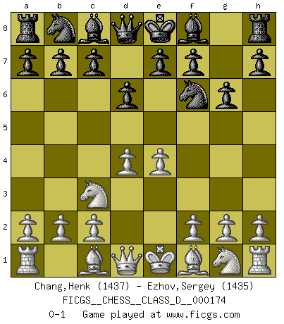 Last move : 0-1 2011 November 11 12:35:46 [Event "FICGS__CHESS__CLASS_D__000174"] [Site "FICGS"] [Date "2011.09.08"] [Round "1"] [White "Chang,Henk"] [Black "Ezhov,Sergey"] [Result "0-1"] [WhiteElo "1437"] [BlackElo "1435"] 1.e4 d6 2.d4 Nf6 3.Nc3 g6 0-1 This chess game has been lost on time (started : 2011.09.08 13:50:0) Pirc defense Player Black won this chess game. Follow this game move after move (download)Chess is thirty to forty percent psychology. You don't have this when you play a computer. I can't confuse it. (Judith Polgar) Spielt Blackmar-Diemer-Gambit, und das Matt kommt von selbst! (Emil Joseph Diemer) Evita las multitudes. Haz independientemente tu propio razonamiento. Trata de ser el jugador de Ajedrez, no la pieza de Ajedrez. (Ralph Charell) Pour moi, les échecs ne sont pas un jeu mais un art. (Alexandre Alekhine) Without enthusiasm, virtue functions not at all, and vice only poorly. (Mignon McLaughlin, The Neurotic's Notebook, 1960)