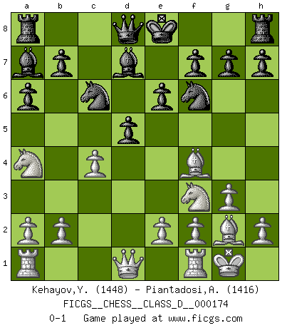 Last move : 0-1 2011 December 4 3:22:13 [Event "FICGS__CHESS__CLASS_D__000174"] [Site "FICGS"] [Date "2011.09.08"] [Round "1"] [White "Kehayov,Yulian"] [Black "Piantadosi,Angelo"] [Result "0-1"] [WhiteElo "1448"] [BlackElo "1416"] 1.Nc3 Nf6 2.d4 d5 3.Nf3 e6 4.g3 c5 5.Bg2 Nc6 6.O-O Be7 7.Bf4 a6 8.dxc5 Bxc5 9.Na4 Ba7 10.c4 Bd7 0-1 Dunst (Sleipner, Heinrichsen) Opening Kingside Castling by player White (move 6) Player Black won this chess game. Follow this game move after move (download)No price is too great for the scalp of the enemy King. (Koblentz) Jeder weiß, dass Gasprom Putins persönliches Machtinstrument ist. Die Firma wird vom Kreml aus geleitet und wird schon deshalb nie transparent sein. (Garry Kasparov) El Ajedrez es un juego de pelea el cual es puramente intelectual e incluye la suerte. (Richard Reti) Le jeu d'échecs fait naître et fortifie en nous plusieurs qualités précieuses dans le cours de l'existence, telles que la prévoyance, la circonspection, la prudence, et la persévérance. (Benjamin Franklin - 1783, la morale des échecs) In every real man a child is hidden that wants to play. (Friedrich Nietzsche)