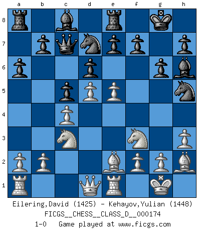 Last move : 1-0 2011 December 4 3:22:13 [Event "FICGS__CHESS__CLASS_D__000174"] [Site "FICGS"] [Date "2011.09.08"] [Round "1"] [White "Eilering,David"] [Black "Kehayov,Yulian"] [Result "1-0"] [WhiteElo "1425"] [BlackElo "1448"] 1.d4 Nf6 2.c4 g6 3.Nc3 c5 4.d5 Bg7 5.e4 d6 6.Nf3 Qa5 7.Bd2 O-O 8.Be2 Nbd7 9.O-O Qc7 10.Re1 a6 11.h3 Re8 12.Bf4 Nh5 13.Bh2 Bh6 14.e5 1-0 King's Indian defense, 3.Nc3 Kingside Castling by player Black (move 7) Kingside Castling by player White (move 9) Player White won this chess game. Follow this game move after move (download)All I want to do, ever, is just play Chess. (Bobby Fischer) Ein typischer, sehr verbreiteter Gedankenschädling ist der, daß der betreffende Amateur von der Annanhme ausgeht, daß jeder einzelne Zug etwas zu leisten habe. (Aaron Nimzowitsch) El ganador de una partida es aquel jugador que hace el penúltimo error. (Savielly Tartakover) L'action d'une oeuvre littéraire se déroule sur un champ de bataille. Les masques et les types du drame moderne correspondent aux pièces du jeu d'échecs. L'intrigue correspond aux coups et aux gambits, c'est à dire aux techniques du jeu telles qu'utilisées et interprétées par les joueurs. Les tactiques et les péripéties [mouvements] correspondent aux coups exécutés par l'adversaire. (Viktor Shklovsky) When you stop learning you start dying. (M. Scott Adams)