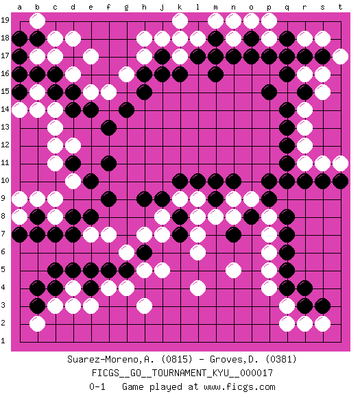 Last move : 0-1 2007 March 4 6:52:50 [Event "FICGS__GO__TOURNAMENT_KYU__000017"] [Site "FICGS"] [Date "2007.01.03"] [Round "1"] [Black "Suarez-Moreno,Alejandro"] [White "Groves,Don"] [Result "0-1"] [Rating 1 "0815"] [Rating 2 "0381"] 1.q16 q3 2.q5 p5 3.q4 p4 4.r3 q2 5.q6 l4 6.d15 d3 7.d5 f4 8.e4 e3 9.f5 d4 10.e5 g4 11.g5 h5 12.h6 j5 13.q10 c17 14.d17 d18 15.c16 e17 16.k16 h17 17.j17 j18 18.k18 h18 19.h16 g16 20.h15 d16 21.c15 e15 22.e14 f15 23.f13 c9 24.c7 c12 25.d11 c11 26.f11 c14 27.d14 c13 28.g14 r14 29.r15 q15 30.p15 r16 31.q14 l6 32.l10 l8 33.n7 n5 34.k7 l7 35.k8 k9 36.j9 j7 37.k10 l9 38.m9 s15 39.r17 s16 40.q17 r13 41.q13 r11 42.r10 s11 43.s10 t11 44.q12 j8 45.h9 h7 46.f9 f7 47.e8 g6 48.c4 c3 49.c5 n9 50.n10 n8 51.o8 m8 52.m10 o9 53.p10 p8 54.q8 p7 55.q7 e7 56.d8 l18 57.l17 k19 58.m18 k17 59.j16 k18 60.m16 c8 61.d7 r2 62.s3 s2 63.r4 m19 64.n19 n18 65.l19 o19 66.o18 m19 67.m17 r18 68.q18 p18 69.o17 s18 70.p9 p6 71.t10 h3 72.b8 b9 73.a7 a9 74.b3 a8 75.b7 b2 76.b4 b15 77.b16 b14 78.q11 r12 79.s17 t17 80.p17 p19 81.n17 n19 82.b18 b17 83.a17 c18 84.a15 a14 85.a16 b19 86.a18 d10 87.e10 d12 0-1 Here are the names of the openings (joseki) played in the four corners : Corner q4 : q3 q5 Komoku (Somok, Xiao~mu`) 3-4 Point. The komoku (3-4) point is the traditional corner enclosure move.. Ikken Takagakari (Hankan Nop'dakeolch'im, Yi Gaogua`jiao~, 1-Space High Approach). The 5-4 approach move has become more popular in modern times, as modern Go emphasizes speed and influence. Corner d4 : d3 d5 Komoku (Somok, Xiao~mu`) 3-4 Point. The komoku (3-4) point is the traditional corner enclosure move.. Ikken Takagakari (Hankan Nop'dakeolch'im, Yi Gaogua`jiao~, 1-Space High Approach). The 5-4 approach move has become more popular in modern times, as modern Go emphasizes speed and influence. Corner d16 : d15 c17 Takamoku (Gomok, Gaomu`) 5-4 Point. The takamoku (high) point (5-4). With its emphasis on influence, the 5-4 point complements the 4-4 (hoshi) point in creating an influence-oriented fuseki. San-san. White plays the 3-3 when Black has a stone at top such as marked. Corner q16 : q16 r14 Hoshi (Hwajeom, Seongjeom, Xingwei`) 4-4 Point. The star or hoshi (4-4) point, emphasizing influence at the potential expense of territory. Ikken Kakari (Hankan Keolch'im, Yi Gua`jiao~, 1-Space Low Approach). White 2 is the standard approach move to the 4-4. Player White won this Go (weiqi, baduk) game. Follow this game move after move (download)Keshi is worth as much as an invasion ! (Anonymous) For peace of mind, resign as general manager of the universe. (Douglas Adams)