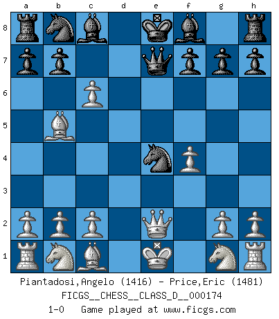 Last move : 1-0 2011 October 29 0:59:41 [Event "FICGS__CHESS__CLASS_D__000174"] [Site "FICGS"] [Date "2011.09.08"] [Round "1"] [White "Piantadosi,Angelo"] [Black "Price,Eric"] [Result "1-0"] [WhiteElo "1416"] [BlackElo "1481"] 1.e4 e5 2.f4 d5 3.exd5 e4 4.d3 Nf6 5.dxe4 Nxe4 6.Bb5+ c6 7.Qe2 Qe7 8.dxc6 1-0 This chess game has been lost on time (started : 2011.09.08 13:50:0) KGD : Falkbeer, 5.de Player White won this chess game. Follow this game move after move (download)When the Chess game is over, the Pawn and the King go back to the same box. (Irish saying) Früher wurde jeder komplizierte Zug, jedes interessante Opfer mit großem Beifall und Enthusiasmus aufgenommen. Heute schaltet man einfach seinen Fritz an, und man kann sehen, was los ist, ob der Zug geht oder nicht. (Vladimir Kramnik) Uno por uno, yo los acribillé, mi superioridad muy pronto se volvio aparente. (Jose Capablanca) Mais n'est-ce pas déjà le limiter injurieusement que d'appeler les échecs un jeu? N'est-ce pas aussi une science, un art, ou quelque chose qui, comme le cercueil de Mahomet entre ciel et terre, est suspendu entre l'un et l'autre, et qui réunit un nombre incroyable de contraires ? (Stefan Zweig) Treat your password like your toothbrush. Don't let anybody else use it, and get a new one every six months. (Clifford Stoll)