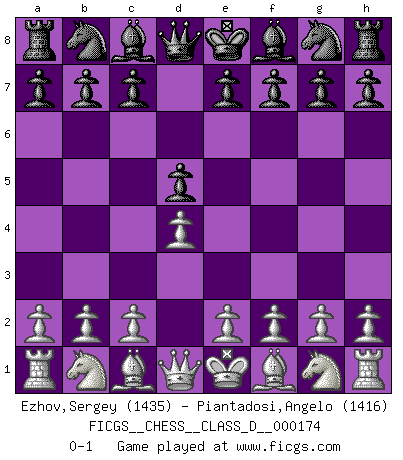 Last move : 0-1 2011 October 19 12:19:33 [Event "FICGS__CHESS__CLASS_D__000174"] [Site "FICGS"] [Date "2011.09.08"] [Round "1"] [White "Ezhov,Sergey"] [Black "Piantadosi,Angelo"] [Result "0-1"] [WhiteElo "1435"] [BlackElo "1416"] 1.d4 d5 0-1 This chess game has been lost on time (started : 2011.09.08 13:50:0) Queen's pawn game Player Black won this chess game. Follow this game move after move (download)The stomach is an essential part of the Chess master. (Bent Larsen) Der 70jährige Viktor Kortschnoi: Die Rentenanstalt wollte mich zwingen in Rente zu gehen. Meine Frau erhält jetzt eine Pension- und ich zahle weiter in die Rentenkasse ein! (Viktor Kortschnoi) No es suficiente ser un buen jugador, se debe también de jugar bién. (Siegbert Tarrasch) Demandez au pauvre Cg1 ce qu'il en pense. Eduard Gufeld à propos de la variante Saemisch de l'Est-Indienne. A shortcut is the longest distance between two points. (Don Groves)