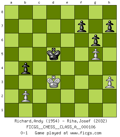 Last move : 0-1 2011 December 10 14:45:25 [Event "FICGS__CHESS__CLASS_A__000106"] [Site "FICGS"] [Date "2011.09.08"] [Round "1"] [White "Richard,Andy"] [Black "Riha,Josef"] [Result "0-1"] [WhiteElo "1954"] [BlackElo "2032"] 1.f4 c5 2.Nf3 Nc6 3.e4 g6 4.Be2 Bg7 5.O-O d6 6.c3 Nf6 7.d3 O-O 8.Nbd2 b5 9.e5 Nd5 10.Ne4 dxe5 11.fxe5 Qb6 12.a4 b4 13.d4 cxd4 14.a5 Nxa5 15.cxd4 Bg4 16.Nc5 Rad8 17.Na4 Qb8 18.Nc5 Nc6 19.h3 Bxf3 20.Bxf3 Bxe5 21.dxe5 Qb6 22.Qc2 Nd4 23.Qf2 Qxc5 24.Kh1 Kg7 25.Bxd5 Qxd5 26.Rxa7 Nf5 27.Bg5 Qxe5 28.Rxe7 Qg3 29.Bf6+ Kg8 30.Re5 Qxf2 31.Rxf2 Rd6 32.Be7 Rd1+ 33.Kh2 Re8 34.Bf6 Rxe5 35.Bxe5 Ne3 36.g4 Rd5 37.Bf4 Rd3 38.g5 Nd5 39.Be5 Kf8 40.Re2 Ke7 41.Kg2 Kd7 42.Re4 Re3 43.Rxe3 Nxe3+ 44.Kf3 Nc4 45.Bd4 Ke6 46.Ke4 Nd2+ 47.Kf4 Nb3 48.Bb6 Kd5 49.Ke3 Nc5 50.Bxc5 Kxc5 51.Kd3 Kd5 0-1 Bird's Opening Kingside Castling by player White (move 5) Kingside Castling by player Black (move 7) 10 pieces endgame at move 50 : White KBPPP , Black KPPPP WHITE : King + 1 Bishop 3 Pawns BLACK : King + 4 Pawns 9 pieces endgame at move 50 : White KPPP , Black KPPPP WHITE : King + 3 Pawns BLACK : King + 4 Pawns Player Black won this chess game. Follow this game move after move (download)When you see a good move, look for a better one. (Emanuel Lasker) Der Vorposten provoziert a) eine Basis für neue Angriffe und b) eine Schwächung der gegnerischen Widerstandskraft in der fraglichen Linie. (Aaron Nimzowitsch) Todos los jugadores de Ajedrez deberían tener un pasatiempo. (Savielly Tartakower) Les réformistes prétendent que les progrès de la théorie conduiront à la disparition des échecs, et qu'il faut, pour leur rendre vie, en remanier les règles. En réalité, qu'exprime cette affirmation? Le mépris de l'intuition, de l'imagination et de tous les autres éléments qui font des échecs un art. (Alexander Alekhine) Beep ! (R2D2 in Star Wars ep.3)