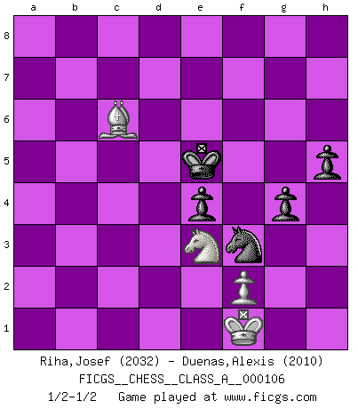 Last move : 1/2-1/2 2011 October 26 12:30:14 [Event "FICGS__CHESS__CLASS_A__000106"] [Site "FICGS"] [Date "2011.09.08"] [Round "1"] [White "Riha,Josef"] [Black "Duenas,Alexis"] [Result "1/2-1/2"] [WhiteElo "2032"] [BlackElo "2010"] 1.e4 e5 2.Nf3 Nc6 3.Bb5 a6 4.Ba4 Nf6 5.O-O Be7 6.Re1 b5 7.Bb3 d6 8.c3 O-O 9.h3 Na5 10.Bc2 c5 11.d4 Qc7 12.Nbd2 cxd4 13.cxd4 Nc6 14.Nb3 a5 15.Be3 a4 16.Nbd2 Bd7 17.Rc1 Qb7 18.Qe2 Rfe8 19.Bd3 Rab8 20.d5 Nb4 21.Bb1 Rec8 22.Nf1 Na6 23.Ng3 Bd8 24.Bd3 Nb4 25.Bb1 Na6 26.Nh4 g6 27.Nf3 Bb6 28.Bh6 Ra8 29.Nf1 Nc5 30.N3d2 Qc7 31.Qf3 Qd8 32.Nh2 Na6 33.Ndf1 Bd4 34.Qe2 Nh5 35.Qd2 Bb6 36.Red1 f6 37.Ng4 Bd4 38.Nge3 Bb6 39.Ng4 a3 40.Rxc8 Qxc8 41.Rc1 Bc5 42.bxa3 Bxg4 43.hxg4 Qxg4 44.Nh2 Qd7 45.Rc3 Bd4 46.Rf3 Ba1 47.Bc2 Nc5 48.Qb4 Na6 49.Qb1 Bd4 50.Rb3 Rb8 51.Nf3 Ba7 52.Bd1 Nc5 53.Rb4 Na6 54.Rb3 Nc5 55.Rb2 Qe8 56.Be3 Nf4 57.g3 Nfd3 58.Rd2 b4 59.Rxd3 bxa3 60.Bb3 Nxd3 61.Bxa7 Rb7 62.Be3 Qb5 63.Nd2 Nc5 64.Qc1 Qb4 65.Bc4 Kg7 66.Bf1 Qb2 67.Nc4 Qxc1 68.Bxc1 Nxe4 69.Bd3 Nc3 70.Nxd6 Rb8 71.Bxa3 Nxd5 72.Bc5 f5 73.Bc4 Nc3 74.a3 Na4 75.Bb4 Nb2 76.Bb5 Kf6 77.Kg2 Ke6 78.Ne8 Rc8 79.a4 e4 80.a5 Nd3 81.Bd2 Rc2 82.a6 Rxd2 83.a7 Ne1+ 84.Kf1 Nf3 85.Nc7+ Ke5 86.Be2 Ra2 87.a8Q Rxa8 88.Nxa8 f4 89.gxf4+ Kxf4 90.Nc7 h5 91.Nd5+ Ke5 92.Ne3 g5 93.Bb5 g4 94.Bc6 1/2-1/2 Ruy Lopez : Closed Kingside Castling by player White (move 5) Kingside Castling by player Black (move 8) Promotion Queen by player White (move 87) 10 pieces endgame at move 89 : White KBNPP , Black KNPPP WHITE : King + 1 Bishop 1 Knight 2 Pawns BLACK : King + 1 Knight 3 Pawns 9 pieces endgame at move 89 : White KBNP , Black KNPPP WHITE : King + 1 Bishop 1 Knight 1 Pawn BLACK : King + 1 Knight 3 Pawns This chess game ended in a draw. Follow this game move after move (download)I have never in my life played the French Defence, which is the dullest of all openings. (Wilhelm Steinitz) Jeder leidlich begabte Spieler, er braucht keineswegs hervorragend veranlagt zu sein, kann es zum Meister bringen. Aber das ist ja auch gar nicht nötig! Der richtige Standpunkt ist es, zu seinem Vergnügen zu spielen, und man glaube ja nicht, dass der Genuss proportional dem Können sei. (Siegbert Tarrasch) El Ajedrez, como cualquier actividad creativa, solo puede existir a través del esfuerzo combinado de aquellos que tienen talento creativo y de aquellos que poseen la habilidad de organizar su trabajo creativo. (Mikhail Botvinnik) On entre au jeu d'Echecs comme on entre en Religion. Pour le joueur d'Echecs, la partie d'Echecs c'est l'office, la messe, le défilé du 1er Mai, le dépôt de gerbe au Monument aux Morts. C'est un drame sacré. (Michel Roos) They say in chess you've got to kill the queen, and then you mate it... Oh I, do you ? (Red Hot Chili Peppers, Fortune faded)