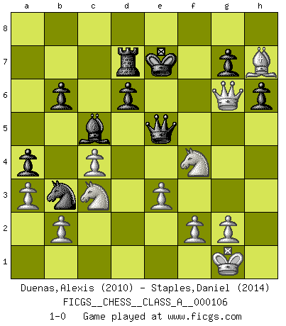 Last move : 1-0 2012 January 12 13:21:55 [Event "FICGS__CHESS__CLASS_A__000106"] [Site "FICGS"] [Date "2011.09.08"] [Round "1"] [White "Duenas,Alexis"] [Black "Staples,Daniel"] [Result "1-0"] [WhiteElo "2010"] [BlackElo "2014"] 1.d4 Nf6 2.c4 e6 3.Nc3 Bb4 4.Qc2 c5 5.dxc5 O-O 6.a3 Bxc5 7.Bf4 Nc6 8.e3 Nh5 9.Bg3 Nxg3 10.hxg3 h6 11.Nf3 f5 12.Be2 a5 13.Rd1 Qe7 14.O-O d6 15.Rd2 b6 16.Rfd1 Bb7 17.Nb5 Rad8 18.Qb3 Kh7 19.Qc3 e5 20.Ne1 e4 21.Nc2 a4 22.Nb4 Na5 23.Nd5 Qf7 24.Nf4 Nb3 25.Bh5 Qe7 26.Bg6+ Kg8 27.Rd5 Qg5 28.Nc7 Bc8 29.Qc2 Qg4 30.Nb5 Bb7 31.Bh5 Qg5 32.g4 Bxd5 33.Rxd5 Rf6 34.gxf5 Rxf5 35.Rxf5 Qxf5 36.Bg6 Qe5 37.Bxe4 Rd7 38.Bh7+ Kf7 39.Qg6+ Ke7 40.Nc3 1-0 Nimzo-Indian : Classical, Pirc variation Kingside Castling by player Black (move 5) Kingside Castling by player White (move 14) Player White won this chess game. Follow this game move after move (download)Blessed be the memory of him who gave the world this immortal game. (A. G. Gardiner) Wenn ich mich einlogge, glauben die Leute gewöhnlich nicht, dass ich es selbst bin und sie fangen an, mir dumme Fragen zu stellen. Und wenn sie es glauben, stellen sie wieder andere dumme Fragen. (Judith Polgar) Si el ingenio solamente fuese necesario para lucirse, las mujeres serían las mejores jugadoras de Ajedrez del mundo. (Albin) La victoire dans une partie d'Echecs appartient la plupart du temps à celui qui voit un peu plus loin que l'adversaire. (Lasker) Luck is when opportunity knocks and you answer. (Anonymous)