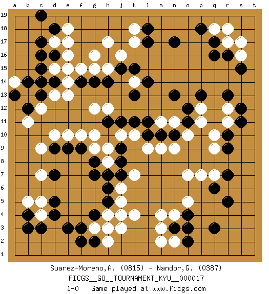 Last move : 1-0 2007 April 1 23:23:43 [Event "FICGS__GO__TOURNAMENT_KYU__000017"] [Site "FICGS"] [Date "2007.01.03"] [Round "1"] [Black "Suarez-Moreno,Alejandro"] [White "Nandor,George"] [Result "1-0"] [Rating 1 "0815"] [Rating 2 "0387"] 1.q16 d17 2.q3 c4 3.e3 d10 4.d7 c7 5.d5 c5 6.d4 q10 7.r13 q7 8.r5 k4 9.n3 n4 10.o4 m4 11.h3 k17 12.n17 o7 13.n13 h4 14.g4 j3 15.h5 j4 16.h7 g16 17.d9 c9 18.c15 g3 19.f3 h2 20.c17 d13 21.c13 m3 22.o2 o5 23.r7 c12 24.d14 e13 25.f14 e14 26.h14 d15 27.c14 k14 28.k13 f15 29.h16 h15 30.j15 g15 31.k15 j16 32.l14 h17 33.g14 o10 34.r10 h12 35.k11 k7 36.j9 g10 37.f9 f10 38.d16 e15 39.d18 e17 40.c3 e16 41.c16 l9 42.m10 m9 43.h11 g12 44.l18 k18 45.l17 p12 46.p13 e18 47.c19 r12 48.s12 r11 49.s11 h8 50.g8 g9 51.j8 h9 52.e9 e10 53.j7 j6 54.h6 j5 55.g7 m11 56.l10 n11 57.o12 p11 58.n10 n9 59.o11 k10 60.l11 j10 61.j11 r17 62.q17 q18 63.p18 r18 64.r16 s16 65.s15 s17 66.b4 b5 67.b3 n2 68.o3 m2 69.q6 p7 70.r9 q9 71.g2 h3 72.f2 a14 73.b12 b13 74.b14 b11 75.a13 1-0 Here are the names of the openings (joseki) played in the four corners : Corner d4 : c4 e3 Komoku (Somok, Xiao~mu`) 3-4 Point. The komoku (3-4) point is the traditional corner enclosure move.. Ikken Kakari (Hankan Keolch'im, Yi Gua`jiao~, 1-Space Low Pincer). The small knight move is the basic approach move to the 3-4 point stone. It has been continually used for over four centuries. There are limitless variations, with new moves constantly being discovered. Black 2 opens the door to a treaure store of joseki. Corner q4 : q3 q7 Komoku (Somok, Xiao~mu`) 3-4 Point. The komoku (3-4) point is the traditional corner enclosure move.. Player Black won this Go (weiqi, baduk) game. Follow this game move after move (download)Never try to cut bamboo joints. (Anonymous) He is a liar. I just don't know what the lie is yet. (Horatio Caine, C.S.I. Miami)