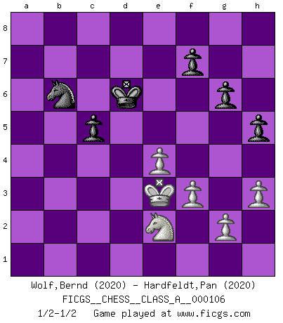 Last move : 1/2-1/2 2012 February 27 15:23:29 [Event "FICGS__CHESS__CLASS_A__000106"] [Site "FICGS"] [Date "2011.09.08"] [Round "1"] [White "Wolf,Bernd"] [Black "Hardfeldt,Pan"] [Result "1/2-1/2"] [WhiteElo "2020"] [BlackElo "2020"] 1.d4 Nf6 2.c4 c6 3.Nc3 d5 4.e3 e6 5.Nf3 Nbd7 6.Qc2 Bd6 7.Bd3 dxc4 8.Bxc4 O-O 9.O-O Qe7 10.h3 e5 11.Bb3 Bc7 12.Rd1 h6 13.Nh4 Rd8 14.Nf5 Qf8 15.Nb5 Bb8 16.dxe5 Nxe5 17.Rxd8 Qxd8 18.Nbd4 a5 19.a4 Bxf5 20.Nxf5 Qd3 21.Bd2 Qxc2 22.Bxc2 Nc4 23.Bc3 Be5 24.Bxe5 Nxe5 25.Nd6 b6 26.Rd1 Kf8 27.e4 Ned7 28.Nf5 Nc5 29.f3 Nfd7 30.Rd6 Rc8 31.Kf2 Nb8 32.Ke3 Nba6 33.Bd3 Nxd3 34.Rxd3 Nc5 35.Rd4 h5 36.b4 axb4 37.Rxb4 Nd7 38.Rd4 Nc5 39.Rc4 g6 40.Nd4 Ke7 41.a5 Kd6 42.axb6 Rb8 43.Rb4 Nd7 44.Rb2 c5 45.Ne2 Rxb6 46.Rxb6+ Nxb6 1/2-1/2 Queen's pawn game Kingside Castling by player Black (move 8) Kingside Castling by player White (move 9) This chess game ended in a draw. Follow this game move after move (download)First-class players lose to second class players because second-class players sometimes play a first-class game. (Tarrasch) Die FIDE ist dabei in die Hände der russischen Mafia zu fallen. (Larry Evans) Las ideas audaces son como las piezas del Ajedrez que avanzan hacia adelante. Ellas pueden ser vencidas, pero también pueden iniciar una partida victoriosa. (Goethe) RxDa4 pat (...) A woman without a man is like a fish without a bicycle. (Gloria Steinem)
