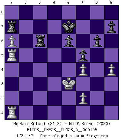 Last move : 1/2-1/2 2011 November 10 16:53:42 [Event "FICGS__CHESS__CLASS_A__000106"] [Site "FICGS"] [Date "2011.09.08"] [Round "1"] [White "Markus,Roland"] [Black "Wolf,Bernd"] [Result "1/2-1/2"] [WhiteElo "2113"] [BlackElo "2020"] 1.d4 Nf6 2.Nf3 e6 3.Bf4 b6 4.c4 Bb7 5.e3 Be7 6.h3 c5 7.Nc3 cxd4 8.Nxd4 O-O 9.Ndb5 Ne8 10.Qd2 a6 11.Nd6 Nxd6 12.Bxd6 Bxd6 13.Qxd6 b5 14.cxb5 axb5 15.Bxb5 Bxg2 16.Rg1 Bf3 17.a4 Qf6 18.Qf4 Qxf4 19.exf4 Nc6 20.Kd2 Rfb8 21.Ke3 Bh5 22.Bxc6 dxc6 23.Rg5 Bg6 24.Rc5 Rxb2 25.Rxc6 Rc2 26.a5 f6 27.Rd1 Kf8 28.Rc5 Rb2 29.Ra1 Rb3 30.a6 Ra7 31.Kd4 Rb6 32.Rca5 Rc6 33.Ne4 Bxe4 34.Kxe4 g6 35.h4 Ke7 36.Ke3 f5 1/2-1/2 Queen's pawn game Kingside Castling by player Black (move 8) This chess game ended in a draw. Follow this game move after move (download)A Chess game is divided into three stages: the first, when you hope you have the advantage, the second when you believe you have an advantage, and the third... when you know you're going to lose ! (Savielly Tartakower) Ich verachte die Medien. (Robert James Fischer) Estaba muy claro de que el punto vulnerable del Gran Maestro Americano (Bobby Fischer) radicaba en las posiciones de doble filo, colgantes, irracionales, donde el siempre falló en encontrar un triunfo aún en una posición de clara victoria. (Efim Geller) La guerre est enfant de la passion, la passion est enfant du narcissisme et le narcissisme est l'enfant. (...) Une autre partie ? (Thibault de Vassal) It's unlucky to be superstitious. (Dave Enteles)