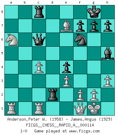 Last move : 1-0 2011 October 13 13:54:52 [Event "FICGS__CHESS__RAPID_A__000114"] [Site "FICGS"] [Date "2011.09.09"] [Round "1"] [White "Anderson,Peter W."] [Black "James,Angus"] [Result "1-0"] [WhiteElo "1958"] [BlackElo "1929"] 1.d4 Nf6 2.c4 e6 3.Nc3 Bb4 4.e3 O-O 5.Bd3 d5 6.Nf3 c5 7.O-O Nc6 8.a3 Bxc3 9.bxc3 dxc4 10.Bxc4 Qc7 11.Bb2 e5 12.h3 Bf5 13.Qe2 e4 14.Nd2 Bg6 15.Nb3 b6 16.Rfc1 Nd8 17.a4 Bh5 18.Qf1 Nb7 19.a5 Nd6 20.Ba3 Rab8 21.axb6 axb6 22.dxc5 bxc5 23.Nxc5 Nxc4 24.Qxc4 Rfd8 25.Qf1 Qc6 26.Na6 Rbc8 27.Be7 Rd2 28.c4 1-0 Nimzo-Indian : 4.e3 O-O, 5.Bd3 d5 Kingside Castling by player Black (move 4) Kingside Castling by player White (move 7) Player White won this chess game. Follow this game move after move (download)Personally, I rather look forward to a computer program winning the world Chess Championship. Humanity needs a lesson in humility. (Richard Dawkings) Ich würde mich als ganz normalen Jungen bezeichnen [Im Alter von 12]. (Sergej Karjakin) El pensamiento metódico es mas útil en el Ajedrez que la inspiración. (C. J. S. Purdy) Les Echecs ont trois composantes : le temps, l'espace et le matériel en dernier. (Mikhail Tal) There are two kinds of people in the world, my friend. Those who have a loaded gun and those who dig. You dig ! (Blondie in The Good, The Bad and The Ugly)